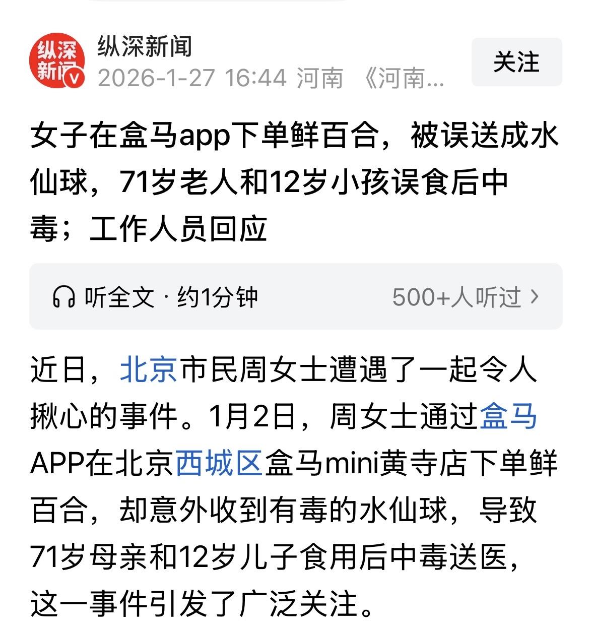 北京,女子在超市下单鲜百合,却收到剧毒水仙球,家里老人也没细看,直接煮汤了,和孩子俩人喝完上吐下泻,送到医院一查才知道食物中毒,超市解释,因为百合和水仙球包装相似,分拣员看走眼才发错了。女子不买账,索赔375万。 周女士孩子感冒了,当妈的心里着急,想着给孩子弄点润肺止咳的鲜百合汤补补身子。 周女士没空自己去买,就在手机上下了个单,地点是家附近的超市。 后来她特意把煮汤的任务交给了家里的老人去办。 可谁能想到,这一锅爱心汤,差点变成了夺命汤。 货很快送到了,老人家代收的。因为平时也不怎么下厨分辨食材,加上包装看着没啥问题,老人家压根就没怀疑这里头装的到底是不是百合。 等汤炖好了,老人就和孩子一起喝了。结果这汤刚下肚没多久,俩人的反应就不对劲了。 先是孩子开始剧烈呕吐,把刚吃的晚饭全吐了出来,紧接着就是头疼、肚子绞痛,孩子难受得直哭,小脸煞白。 老人也没能幸免,头晕眼花,站都站不稳,也是上吐下泻。 周女士一得知消息,吓得魂都飞了,赶紧打了120。 到了医院一检查,食物中毒了。罪魁祸首就是那锅汤里的“百合”。 等周女士缓过神来仔细看那个包装盒,才发现里面装的根本不是什么鲜百合,而是水仙球! 这玩意看着跟百合是有点像,都是白白胖胖的球茎,但它有毒啊!全株有毒,误食轻则呕吐腹泻,重则昏迷甚至危及生命。 更让周女士气愤的是,这水仙的标识就印在包装盒侧面一个不起眼的位置,老人眼神不好,根本看不见。 这是把有毒的观赏植物当成食材给送过来了啊! 这事儿搁谁身上能忍?孩子遭了罪,大人也跟着倒霉,还得去医院洗胃、输液。 好在到了1月3号,经过治疗,孩子和老人总算出院了,但这心理阴影怕是一时半会儿消不掉。 事情闹大后,超市那边也慌了神。 据相关工作人员解释,这纯粹是一起低级的分拣乌龙。 原来,当时店里同时段有另一个订单是买水仙种球的,分拣员在忙乱中看走了眼,把那有毒的水仙球当成百合给塞进了周女士的袋子里。 理由就是包装相似、操作失误。 但对于消费者来说,你卖的是吃的,我买的也是吃的,你给我送个有毒的观赏植物,这不仅仅是失误,简直是拿人命开玩笑。 1月28号,超市方面对媒体采访,表示,出事当晚就知道顾客送医了,3号出院后,公司立马成立了专项小组,还制定了赔偿方案。 但问题来了:双方谈崩了。 超市那边说想私下和解,也愿意赔,但他们觉得周女士索赔金额太高了,因为她一上来就要375万。 后来,周女士把赔偿金降到48万,但超市依旧表示无力赔偿。他们顶多只愿意赔偿7万。 现在这事儿还在扯皮阶段,超市说会配合相关部门承担责任,也整改了流程,但周女士表示,她准备起诉。 有人就分析,这事儿不能光怪分拣员眼神不好。根本原因还是超市管理有漏洞。 食品区和非食品区如果没有严格物理隔离,光靠人眼去分辨,早晚得出事。 站在周女士的角度想,这事儿真的太憋屈了。 她在手机上轻轻一点,是出于对平台的信任,觉得大公司不会卖假货烂货。结果呢?这份信任换来的是孩子在医院里受罪。 她心里肯定在想,如果我当时自己去菜市场买,是不是就没这档子事了?或者哪怕包装再醒目一点,老人是不是就能发现不对劲? 而对于超市来说,这也是个响亮的耳光。 生鲜电商主打的就是“快”和“鲜”,但如果连最基本的安全和准确都做不到,所谓的新零售就是个笑话。 分拣员的一次手滑,代价可能是一个家庭的悲剧,也可能是企业信誉的崩塌。 根据《消费者权益保护法》第49条规定:经营者提供商品或者服务,造成消费者或者其他受害人人身伤害的,应当赔偿医疗费、护理费、交通费等为治疗和康复支出的合理费用,以及因误工减少的收入。 在本案中,超市作为经营者,因分拣失误将有毒的水仙球当成鲜百合配送,直接导致消费者中毒就医,已经构成了侵权行为。 超市不能仅以操作失误或者包装相似为由推脱责任,必须承担上述法律规定的严格赔偿责任。 这不仅包括孩子和老人的医疗费、护理费、交通费等实际损失,如果造成了更严重的后果,还需支付残疾赔偿金。 此外,除了物质赔偿,受害者还有权主张精神损害赔偿。 这也提醒大家,哪怕是再大的牌子,送来的东西如果是入口的,尤其是给孩子老人吃的,拆开包装那一刻,一定要多长个心眼,仔细看看、闻闻。 在这个追求效率的时代,机器和人工都会犯错,但咱们的身体只有一个,犯不起错。 对此,你怎么看? 关注@运良说法