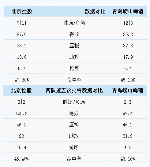 北京控股与青岛崂山啤酒历史上一共交手24次,青岛崂山啤酒15胜9负。上赛季两队交手2次,青岛崂山啤酒1胜1负。