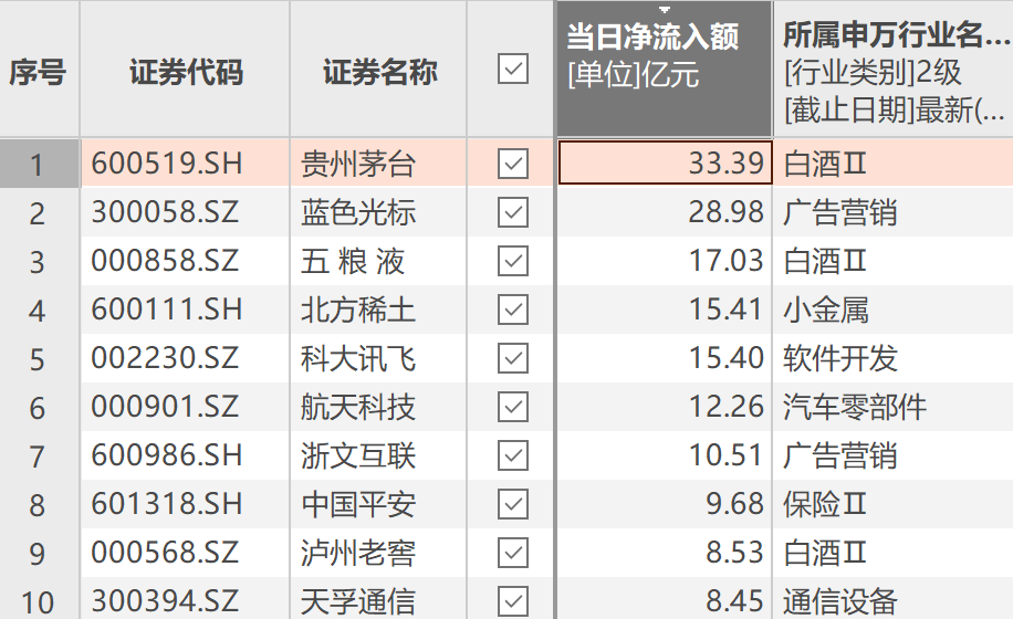 上证报中国证券网讯(记者徐蔚)Choice数据显示,1月29日,资金净流入额排名前十的个股依次是:贵州茅台、蓝色光标、五粮液、北方稀土、科大讯飞、航天科技、浙文互联、中国平安、泸州老窖、天孚通信。其中,贵州茅台获净流入超33亿元,五粮液获净流入超17亿元。