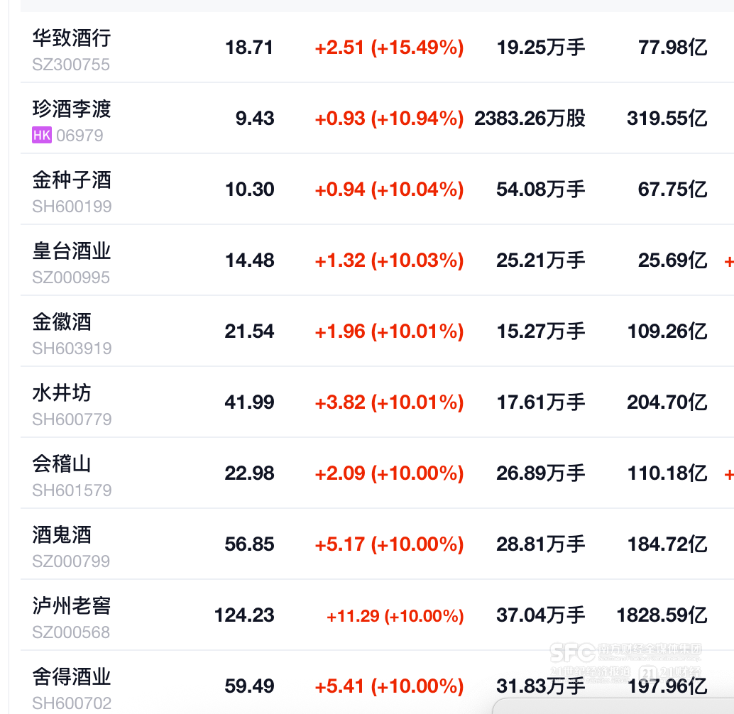 1月29日午间开始,白酒板块持续拉升,白酒股集体大涨。截至29日14点10分,泸州老窖、珍酒李渡、金种子酒、皇台酒业、金徽酒、水井坊、酒鬼酒、舍得酒业纷纷涨停,山西汾酒、古井贡酒、迎驾贡酒涨幅超9%,贵州茅台、五粮液、今世缘、口子窖涨超8%,洋河股份涨幅超7%。涨幅最高的是酒类连锁股华致酒行,29日下午两点多涨幅一度超过16%。