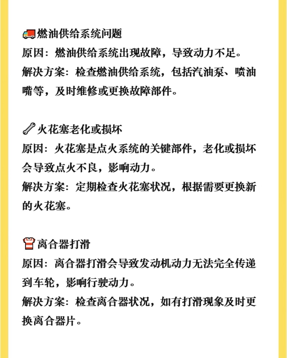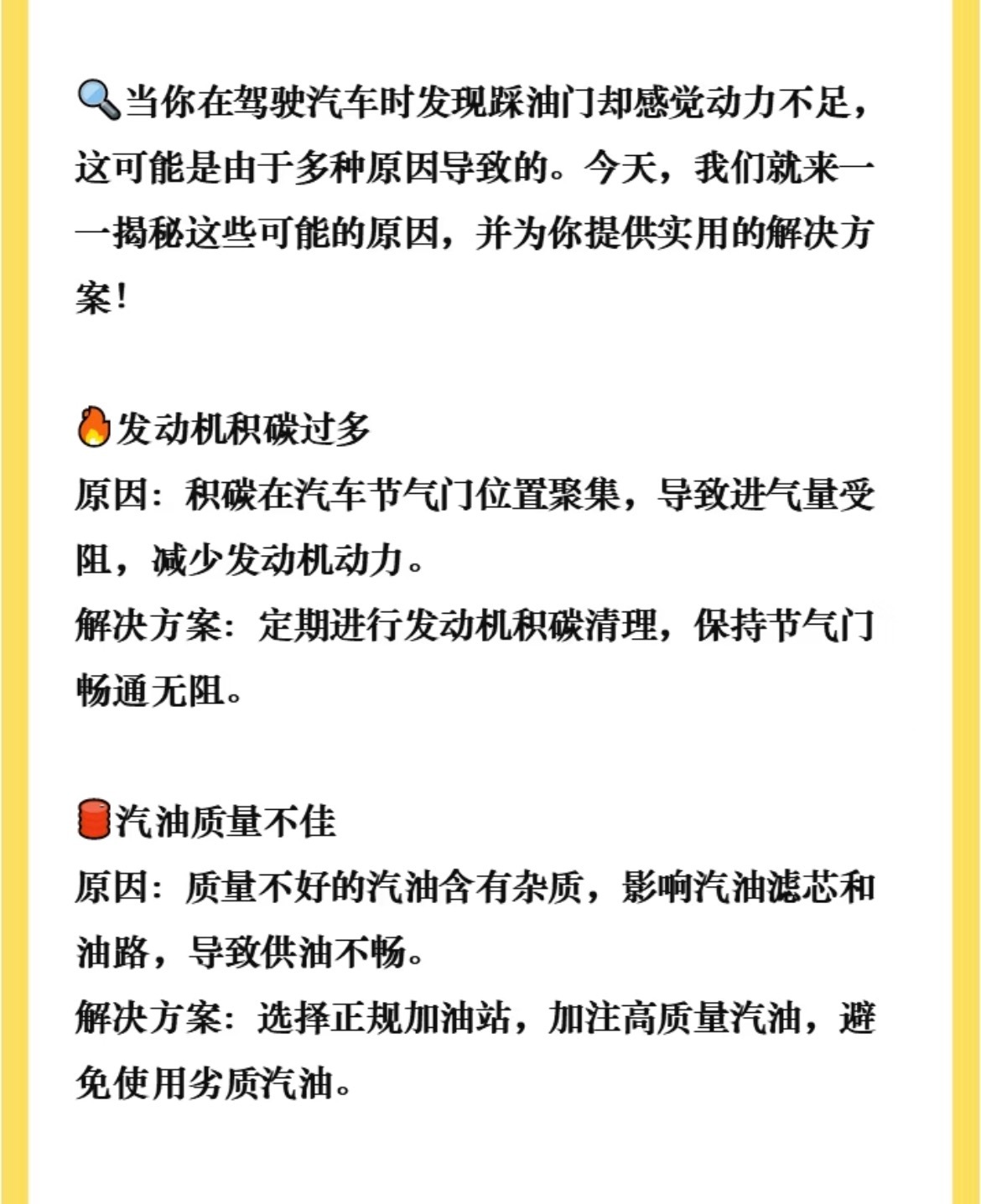 踩油门光吼不走?动力“虚”得像没睡醒?别急着怀疑人生,可能是这5个地方在拖后腿!🚗 发动机积碳过多症状:怠速抖、加速闷、油耗悄悄涨原因:节气门被积碳糊住,进气不顺对策:定期清洗节气门,别等到车“喘不过气”⛽ 汽油质量不佳症状:动力断断续续,发动机声音发闷原因:劣质汽油堵塞油路,喷油嘴都“吃不饱”对策:认准正规加油站,别为省小钱伤发动机🔌 火花塞老化/损坏症状:点火困难、加速顿挫、怠速不稳原因:火花塞寿命到了,点火能量不足对策:定期检查更换,别让它“带病上岗”🛢️ 燃油供给系统故障症状:行驶中突然无力,甚至熄火原因:汽油泵、喷油嘴等部件出问题对策:及时检修,别等半路“罢工”才着急🔄 离合器打滑症状:转速飙高但车速上不去,油耗猛增原因:离合器片磨损,动力传不到轮上对策:检查离合器,该换就换,别硬撑我与汽车的日常大v聊车