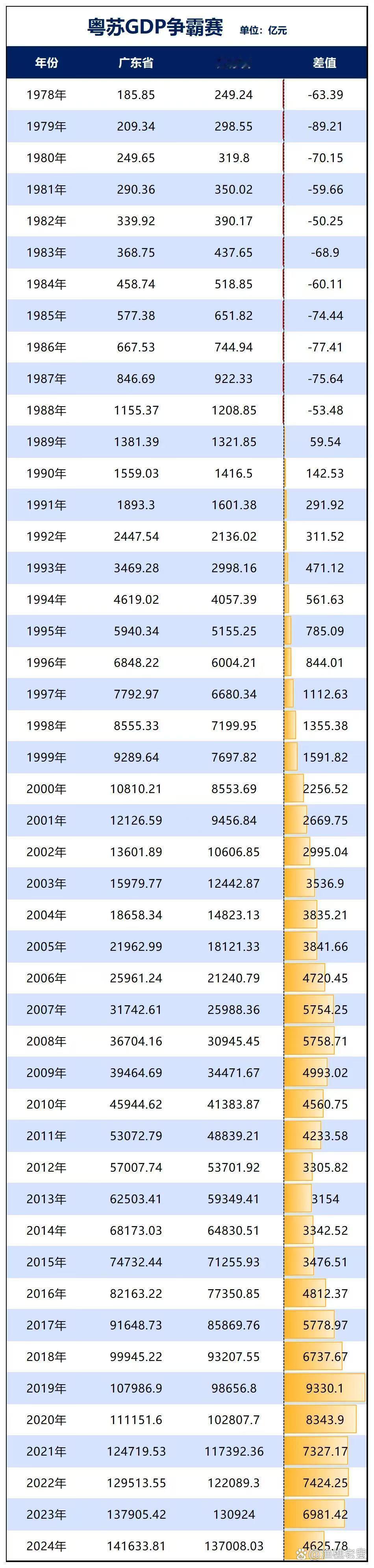 2025年江苏与广东的GDP差距进一步缩小到只有3448亿元,AI分析认为江苏2027年将超越广东!具体分析如下: 2025年江苏GDP为14.24万亿元,广东14.58万亿元,两者差距约3448亿元,江苏仍未超越广东,豆包分析认为这几年江苏仍未能超越广东主要原因有以下五点: 1.核心引擎与极点效应 广东是双核+强极点:深圳、广州为“3万亿级”引擎,叠加佛山、东莞等,四城GDP占全省超六成,创新与资本集聚效应极强。 江苏是群狼效应均衡发展,但缺乏能定义行业的全球科技巨头,属于有“高原”缺“高峰”格局。比如,江苏13市全百强、5个万亿级城市,但苏州非省会,而南京作为省会城市辐射有限。 2.人口规模与结构 广东常住人口约1.28亿,自然增长约3.69‰,人口年轻、消费与劳动力红利突出。 而江苏人口约0.85亿,自然增长率-2.5‰,增长更依赖外来流入,人口结构偏老、内需规模不及广东。 3.科创与产业生态 广东有华为、腾讯、大疆等龙头企业,它们能定义行业标准,硬科技与平台经济引领性更强。 江苏研发投入与专利多,但成果转化与本土巨头培育不足,先进制造偏To B,品牌与终端影响力弱于广东To C集群。 4.金融与开放平台 广东有深交所,深圳对接中央财政,叠加粤港澳大湾区与港澳联动,国际资本与高端要素集聚更强。 江苏缺乏全国性金融交易平台,区域金融中心能级不足,开放更多依托长三角协同,国际化枢纽功能弱于广东。 5.财政与区域治理 广东仅深珠汕为二级财政,省级统筹资源支持粤东西北与对口帮扶,集中力量办大事能力强。 江苏13市均为二级财政,县域自主权大、发展均衡,但资源分散,难形成强中心的规模效应。 这也是自1989年江苏GDP被广东 反超后,一直被广东稳压一头的重要原因。 不过近3年来,江苏追赶速度加快,与广东的差距越来越小,在未来几年内有望超越广东。 比如2025年江苏GDP增速比广东更快(2025年江苏5.3% vs 广东3.9%),两者差距持续收窄。 能否超越关键看点在于:江苏能否补齐头部企业与终端品牌短板;广东能否稳住极点优势、缩小区域差距。 从短期看广东仍将领先,但长期趋势上江苏若能保持制造业与科创优势,超越概率会大增。 所以根据目前的经济走势和相关分析,江苏经济有可能在2027年实现对广东的全面超越。 2025年前三季度,广东GDP为10.52万亿元,江苏为10.28万亿元,差距缩小到2366亿元。且江苏的GDP增速已连续5年超过广东,2025年江苏增速约5.4%,广东约4.1%,增速差约1.3个百分点。若这一趋势保持,江苏一年大约能追回2500亿至3000亿元的差距。 据此推算,2026年全年两省的差距可能被压缩至1000亿-2000亿元,江苏很难在2026年完成反超。但如果江苏能保持住制造业和内需的优势,且广东的外贸和房地产未能强力反弹,2027年将是江苏实现总量反超的最可能时间窗口。 大家觉得明年江苏GDP能超越广东成为一哥吗?