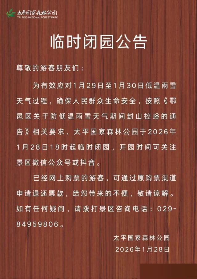 1月28日,太平国家森林公园发布临时闭园公告:为有效应对1月29日至30日低温雨雪天气过程,太平国家森林公园于28日18时起临时闭园。