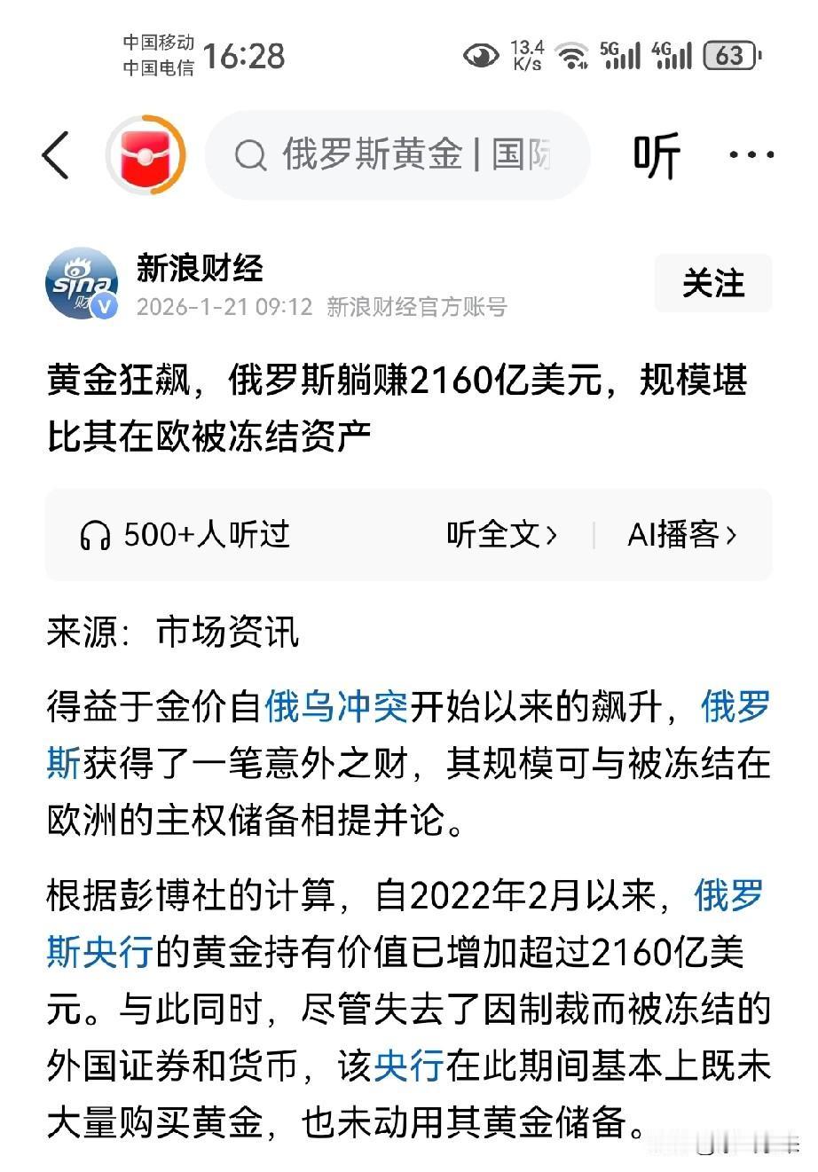 黄金大涨最大的受益者是俄罗斯 普京闷声发大财,特朗普你使劲闹腾,动静越大越好! 俄罗斯早就囤积了大量黄金,低位买进很多,随着黄金价格一路飙升,目前俄罗斯所持有的黄金已经赚了2000多亿美元! 欧盟虽然冻结了俄罗斯在欧盟的资产,但俄罗斯却丝毫不惧!家里有粮心不慌! 俄罗斯已经就欧盟冻结其资产进行了交涉和维权! 另外一个方面美国把世界搅得天翻地覆,这对俄罗斯来说并不是坏事!特朗普的一系列迷之操作,加剧地区局势和动荡,间接推动和加剧黄金价格不断上涨,还会加剧石油价格上涨,众所周知俄罗斯地大物博,最不缺的就是石油! 普京甚至在格陵兰岛问题上都没有很反对特朗普! 普京是个明白人!普京 俄罗斯 黄金行情价格