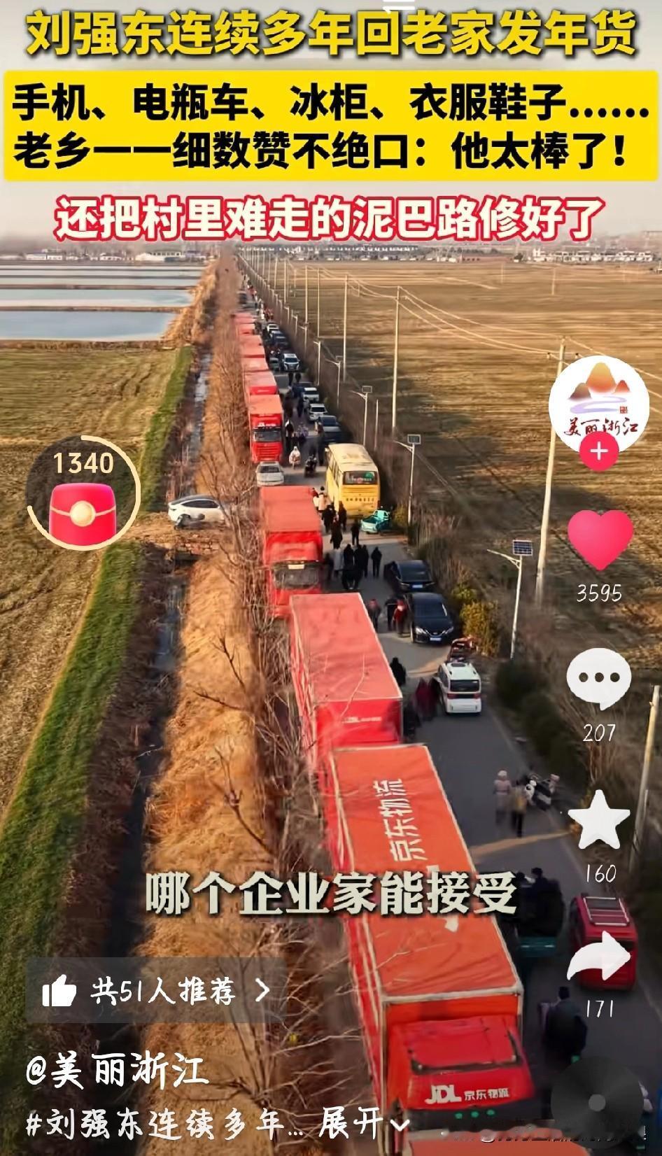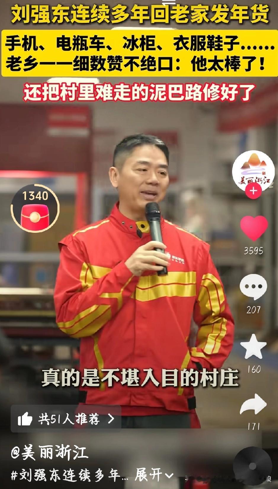人家记着34年前乡亲们凑的500块和76个鸡蛋,一报恩就是12年,从发红包到送年货,再到建产业园让老乡家门口挣钱,从来不是作秀,是刻在骨子里的念旧。 有人酸他博眼球,可村民的笑容骗不了人,实实在在的好处落在手里,比啥都强。树高千尺不忘根,这样的感恩,真的太难得! 刘强东连续多年回老家发年货 刘强东为老家送超万件年货 光明村的年味太浓了 滴水之恩涌泉相报 刘强东 京东 图片截图于美丽浙江