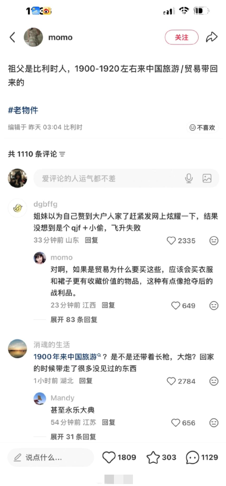 中国女子炫耀比利时男友的收藏! 说男友曾祖父1900-1920年,来中国旅游、贸易带回去的! 结果网友扒出,这大概率是八国联军侵华罪证…… 1900年,正是八国联军侵华时期,那时候来中国旅游贸易?只有炮火轰开国门掠夺! 而且这一看就是喜服,谁会卖掉自己的喜服? 现在这女的已经删号跑路了![摊手]海外生活分享 欧洲中国文物 老外收藏