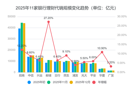 仅看年末两个月的数据,银行理财仍然呈现“季末收缩”特征。11家银行中,仅兴业、中信、华夏3家银行12月代销规模环比11月微升,增幅分别为0.45%、0.37%、0.23%,其他8家银行规模均有所微降。