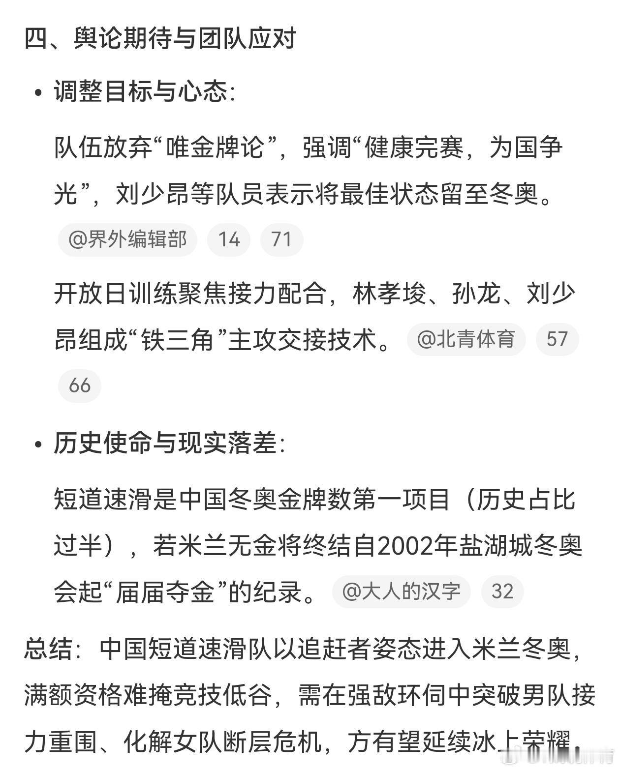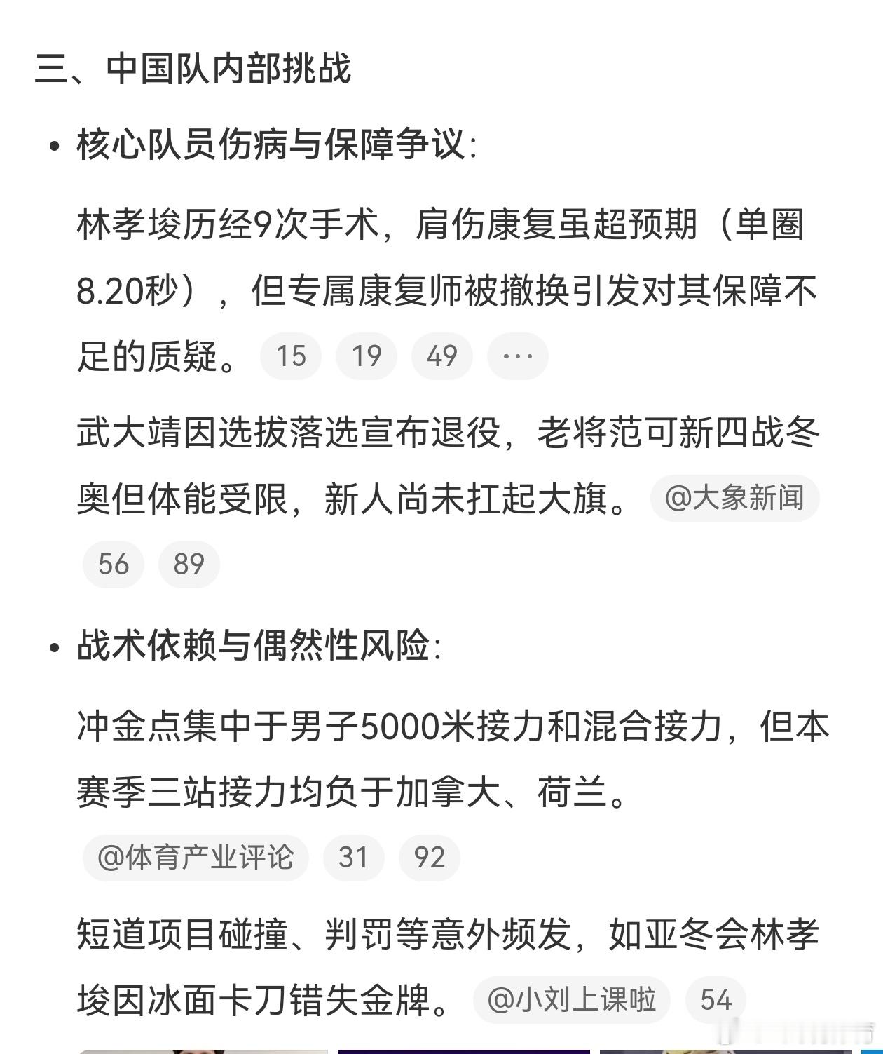 中国短道冬奥面临重重挑战中国短道速滑队以满额资格出征米兰冬奥会,但本赛季世巡赛仅获1金6银4铜的成绩,创近四届冬奥周期最差战绩,面对欧美强队崛起、女队实力断层及核心队员伤病等挑战,冲金形势严峻。一、竞技状态与历史低谷战绩滑坡:本赛季四站世巡赛仅获混合接力1金,总奖牌数(11枚)远低于北京冬奥周期同期水平,男子500米、1000米等传统强项未达预期,女队个人项目零奖牌。2025年世锦赛主场作战仅获1银1铜,为1994年以来最差表现。女队短板突出:女队缺乏顶尖选手,个人项目无人晋级A组决赛,接力项目依赖男选手支撑,与韩国、加拿大差距显著。