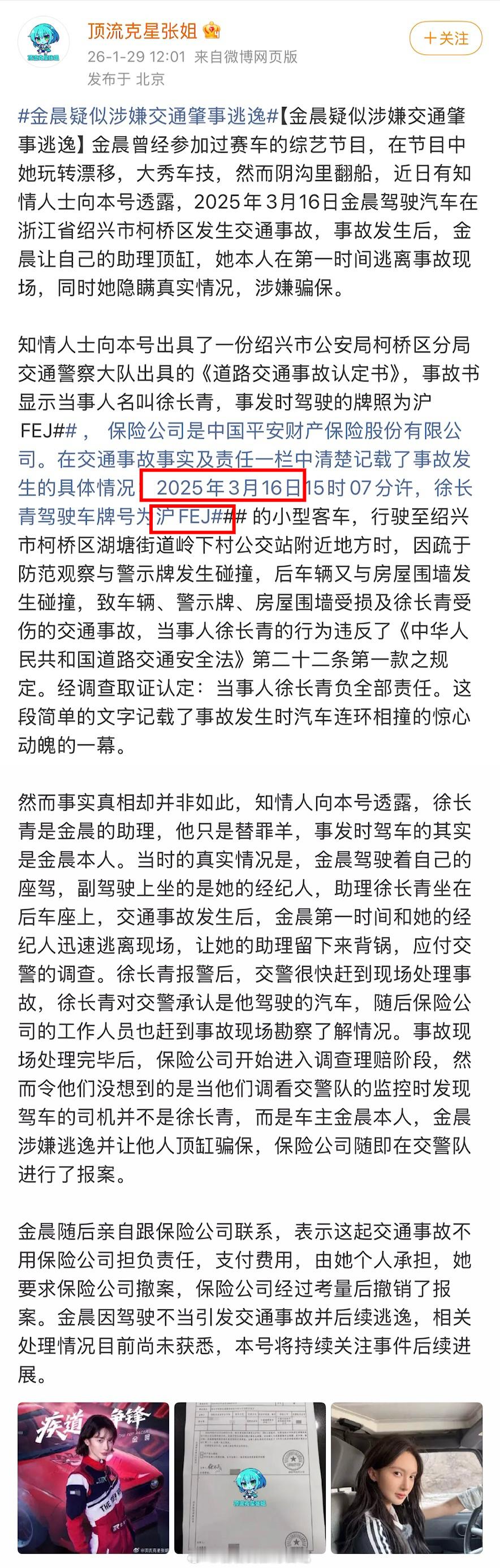 事故认定书都有…越看越像是身边朋友搞的她,之前因为疯狂动物城配音好感她,不是金晨