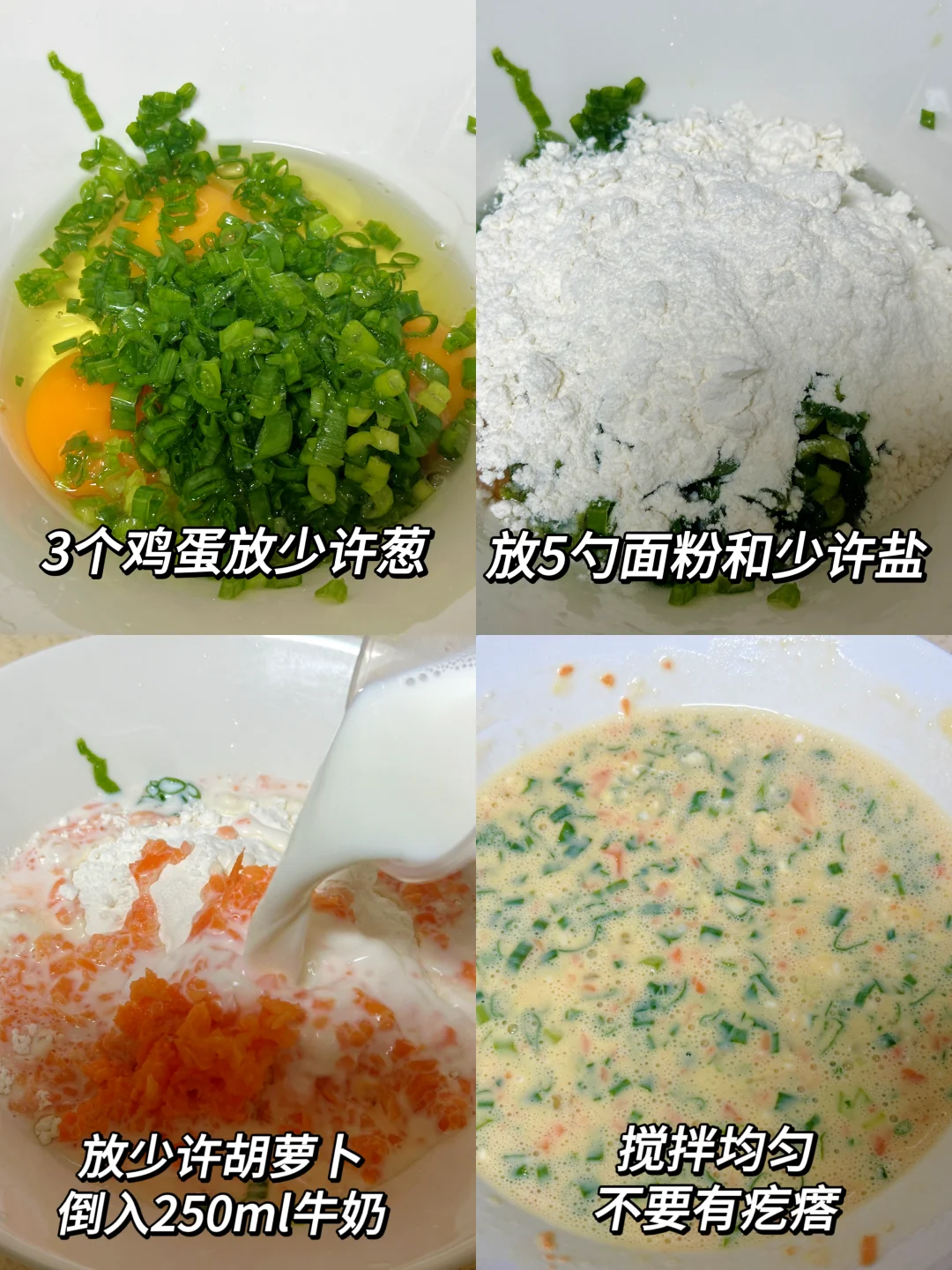 ❶打入3个鸡蛋+葱花+5勺面粉+少许盐+放少许胡萝卜碎+导入250ml牛奶,搅拌均匀不要有颗粒(面糊别太稠,能流动的状态最佳)