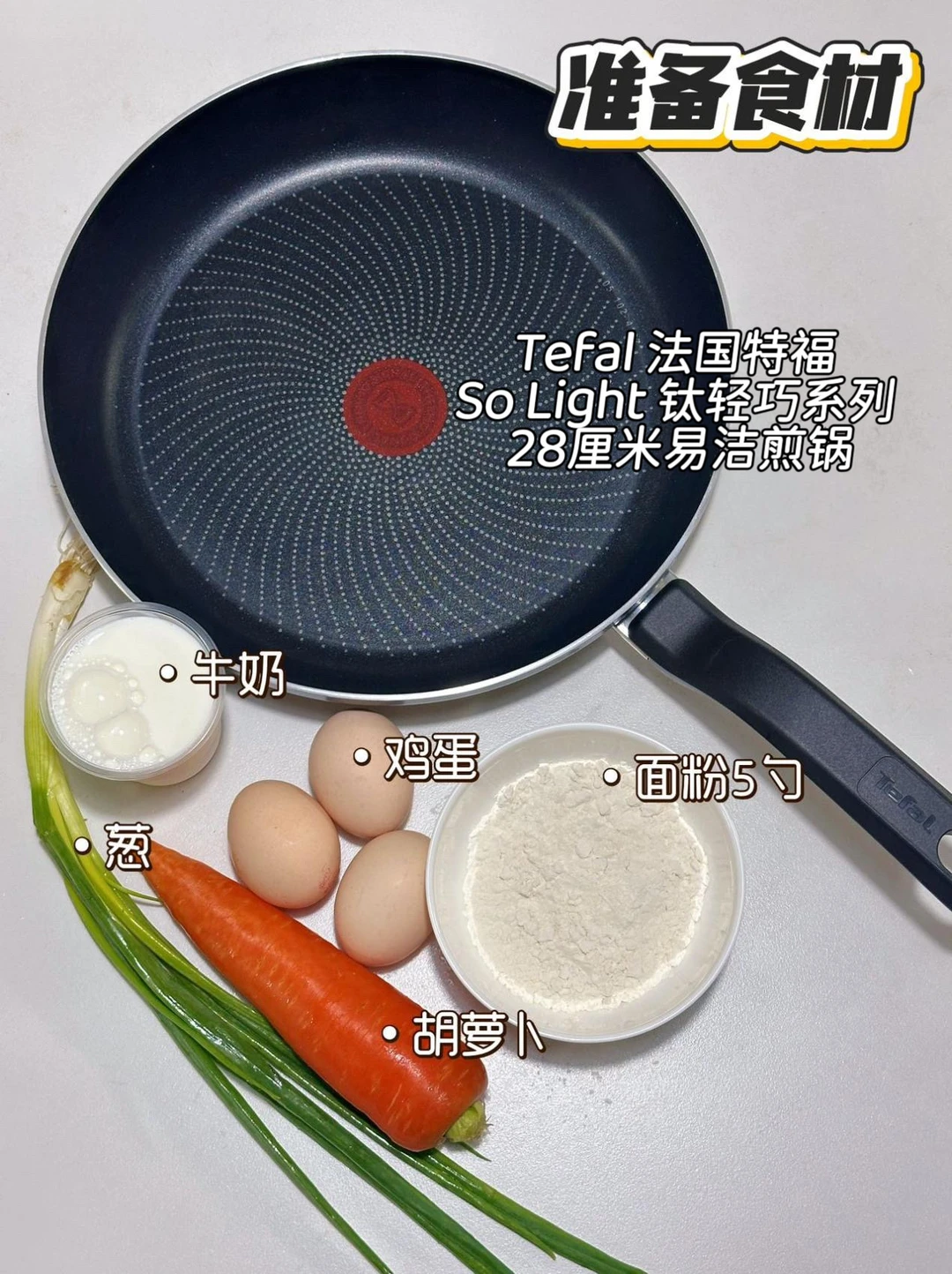 鸡蛋3个、葱花、面粉25g、牛奶250ml,胡萝卜