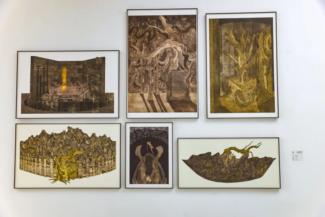 那天最先被这几幅国画吸引住目光👀 这几幅国画画风独特,画面构图很有张力。有的画中线条蜿蜒曲折,像是有着生命力一般;有的画色彩搭配和谐,给人一种古朴又神秘的感觉。