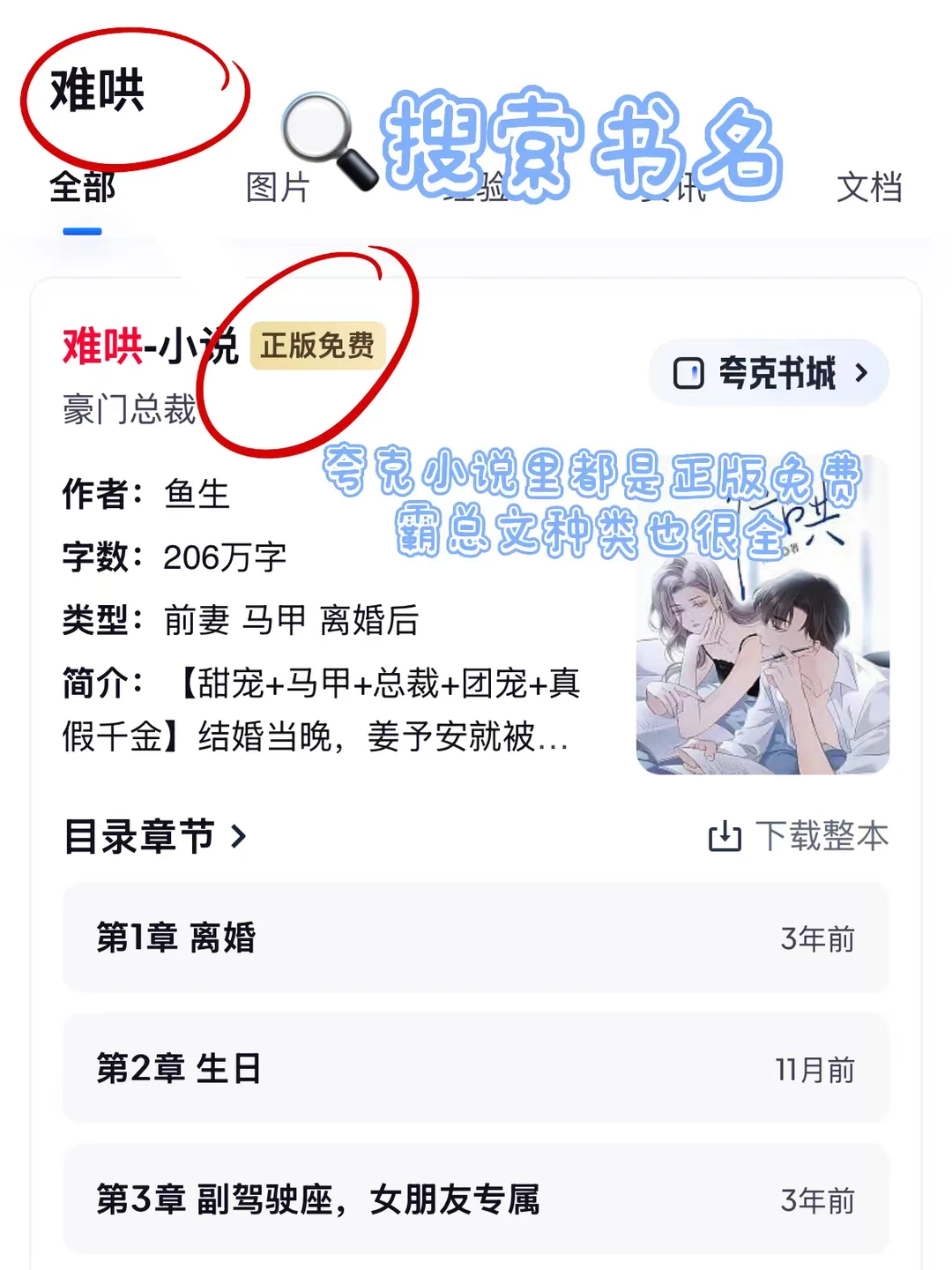 找到个能一口气读完不心跳的地方,在夸克小说搜《难哄》直接出完整正版,关键是免费,而且页面干净得像总裁办公室的落地窗,没任何乱七八糟的贴片广告,最爽的是看到“安安,复婚吗”那段时,再也没被购物弹窗打断,终于能好好心疼女主了💔
