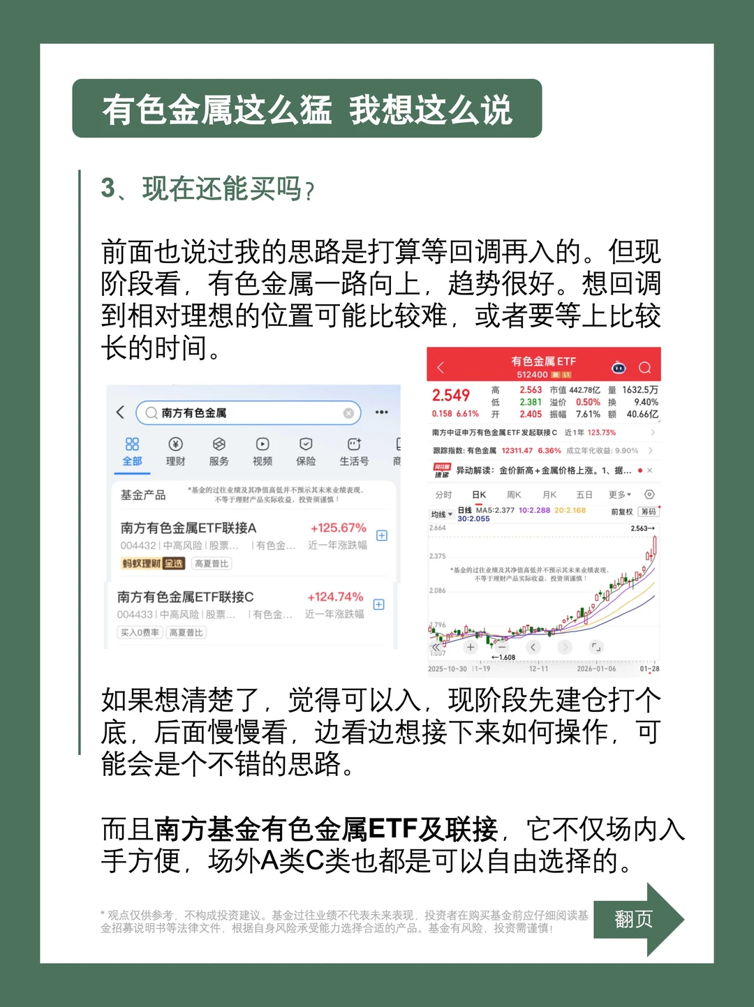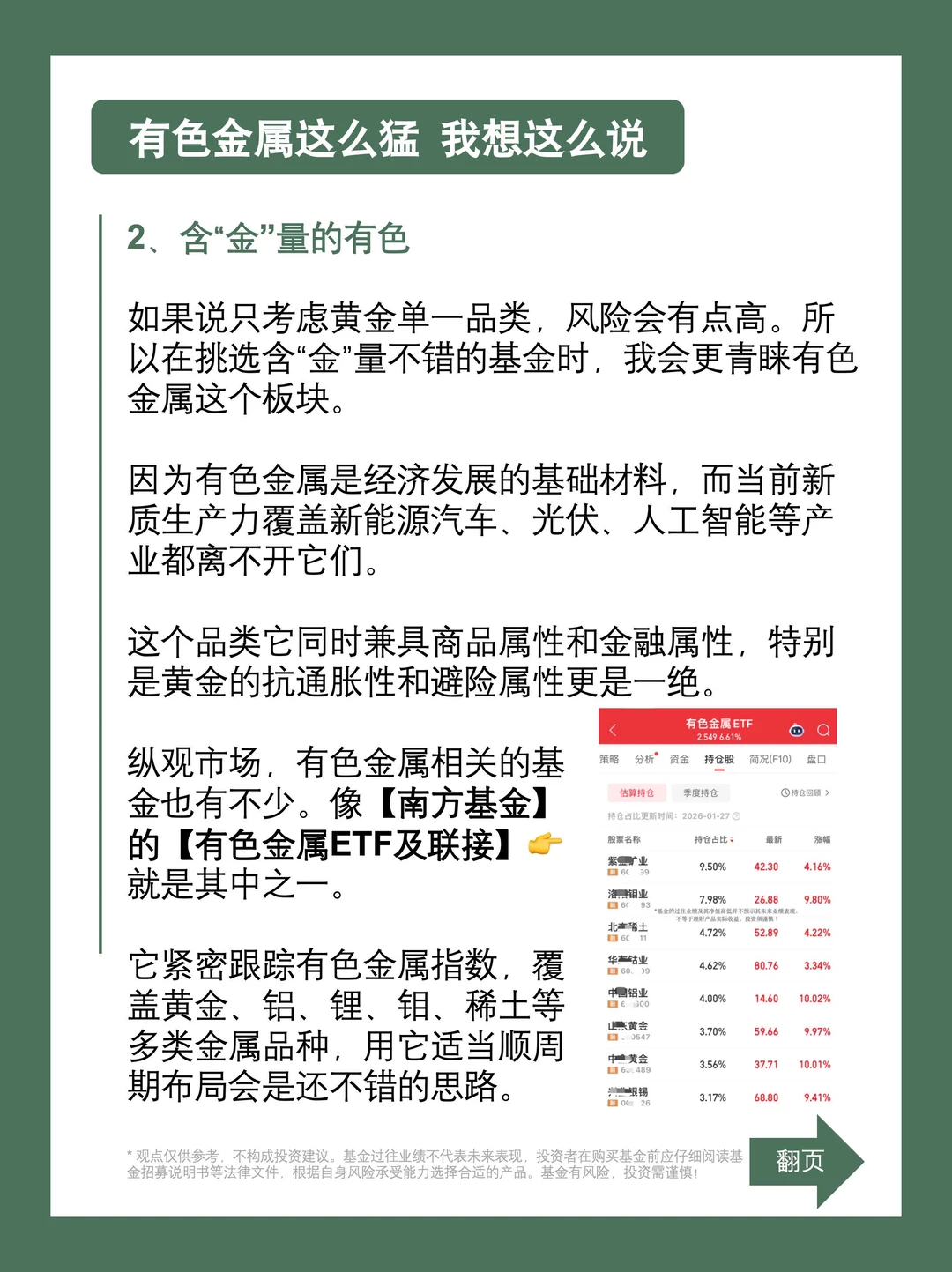 纵观市场,有色金属相关的基金也有不少,像南方基金的有色金属ETF及联接就是其中之一,它紧密跟踪有色金属指数,覆盖黄金、铝、锂、钼、稀土等多类金属品种,我觉得用它适当顺周期布局会是还不错的思路。