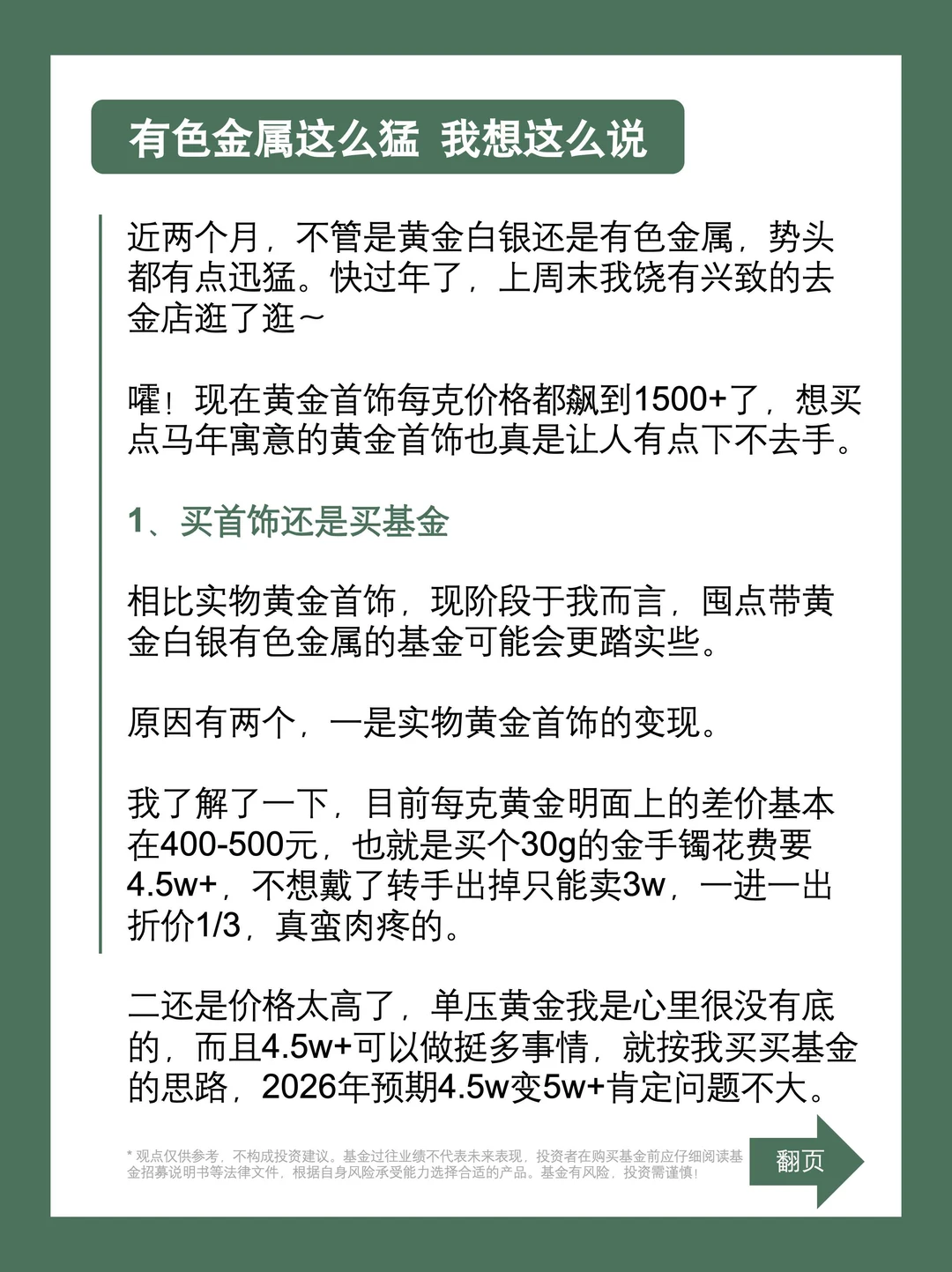 相比实物黄金首饰,现阶段于我而言,囤点带黄金白银有色的基金可能会更踏实。一是实物黄金首饰的变现。基本折价1/3,就蛮肉疼的。二还是价格太高了。照现在的行情和接下来的预期,我觉得在马年买点含“金”量不错的基金可能会是更好的选择。