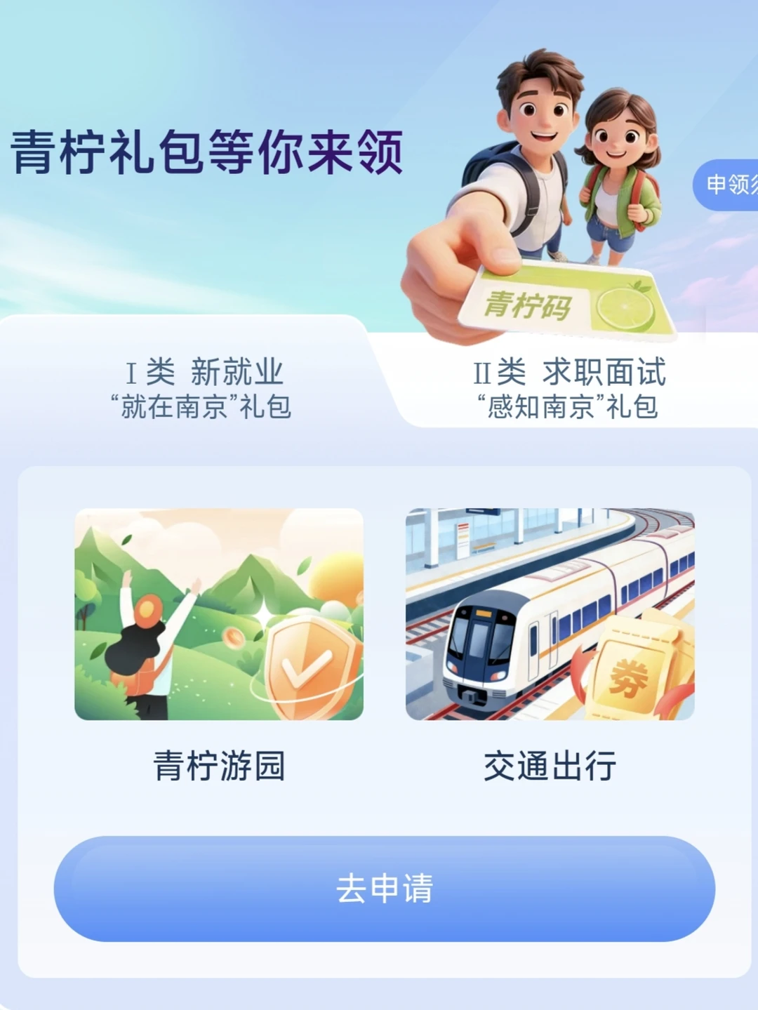 [一R]I类:新就业“就在南京”礼包,包含青柠游园和交通出行福利