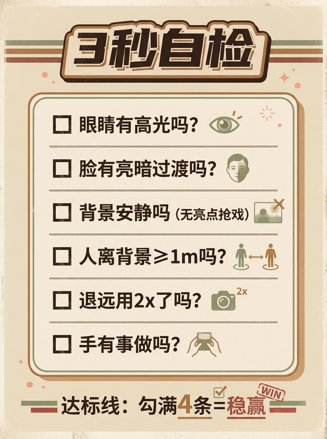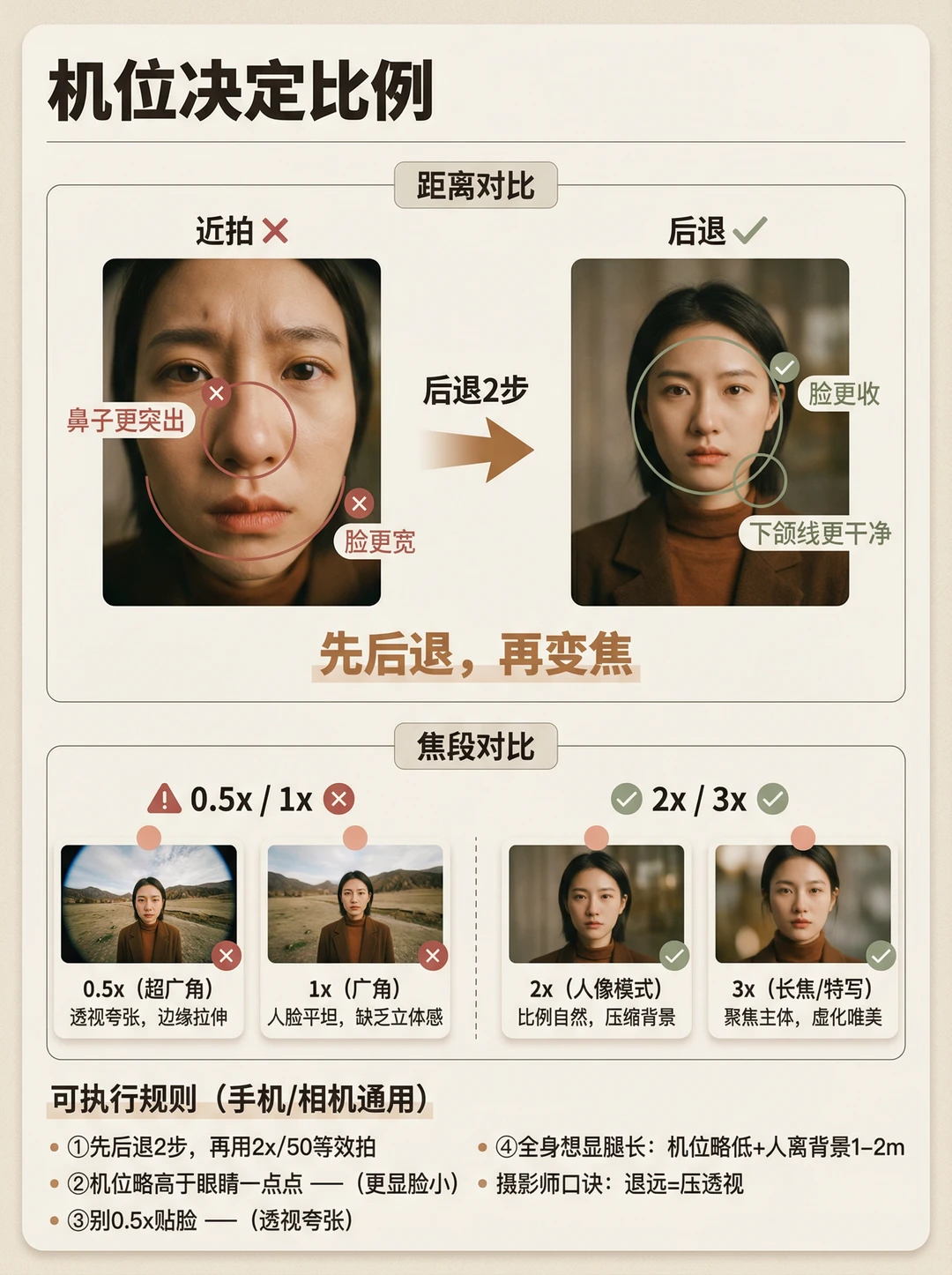 ③ 摆机位:先后退再变焦(2x/50等效更显脸小)