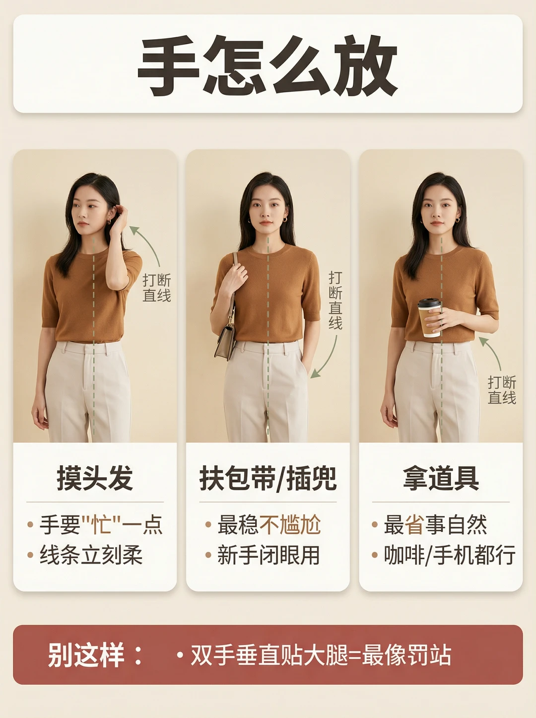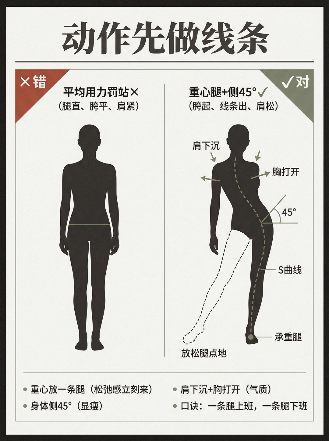 ④ 给动作:重心腿+侧45°,线条立刻顺