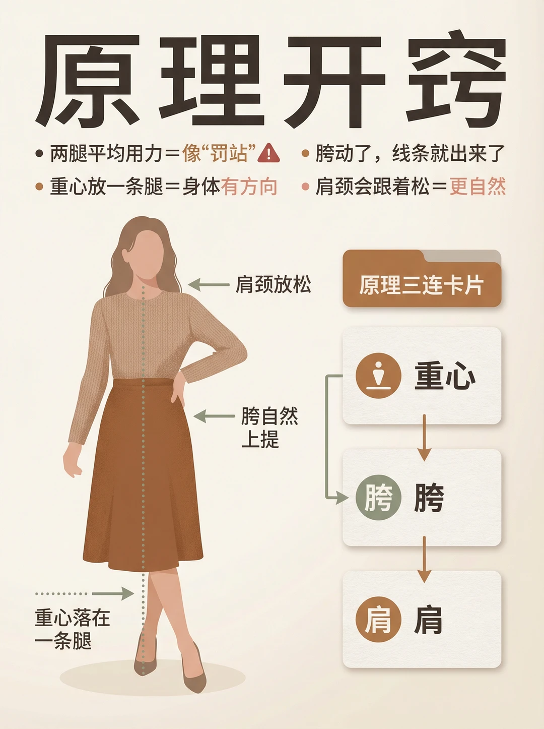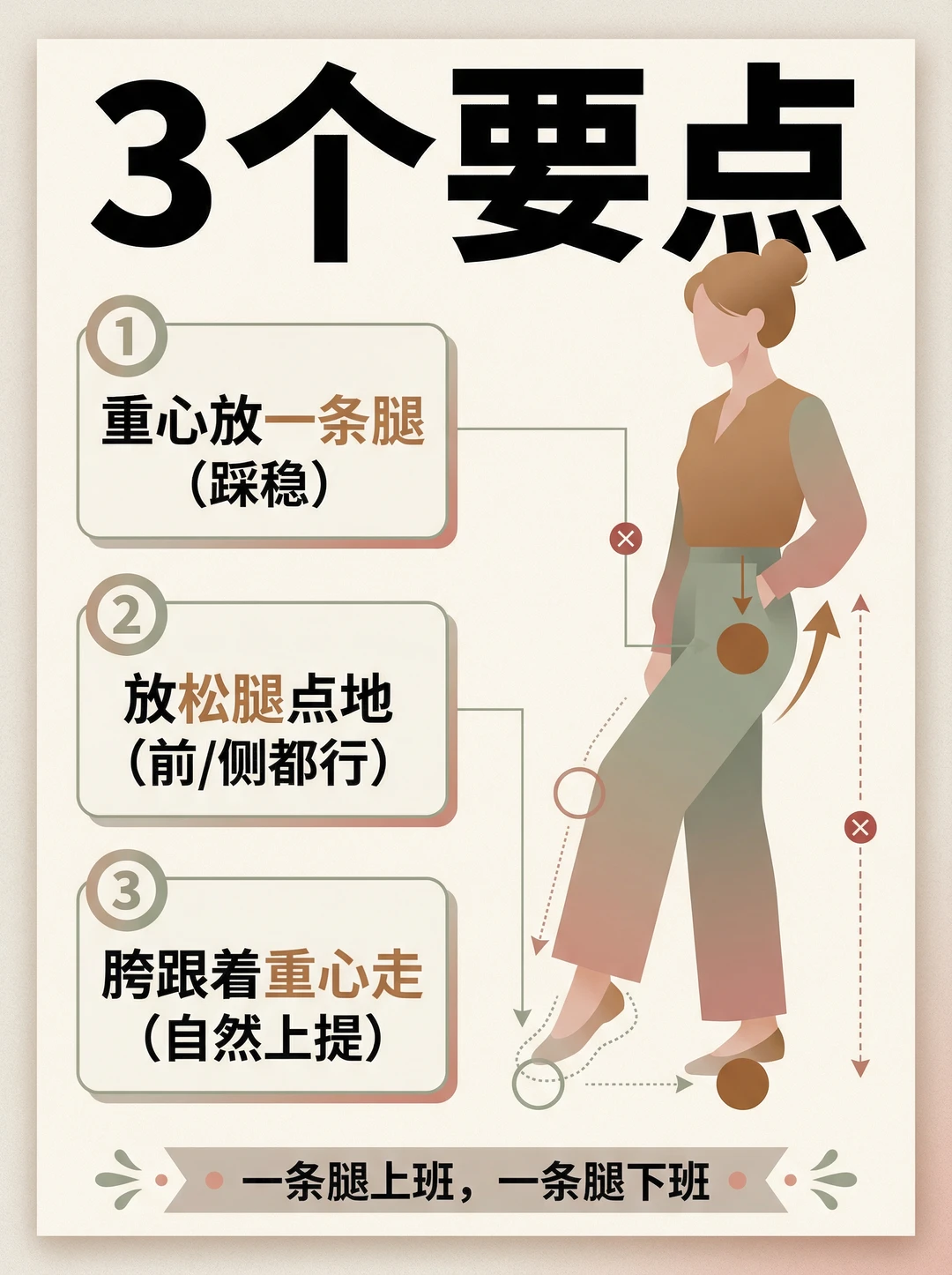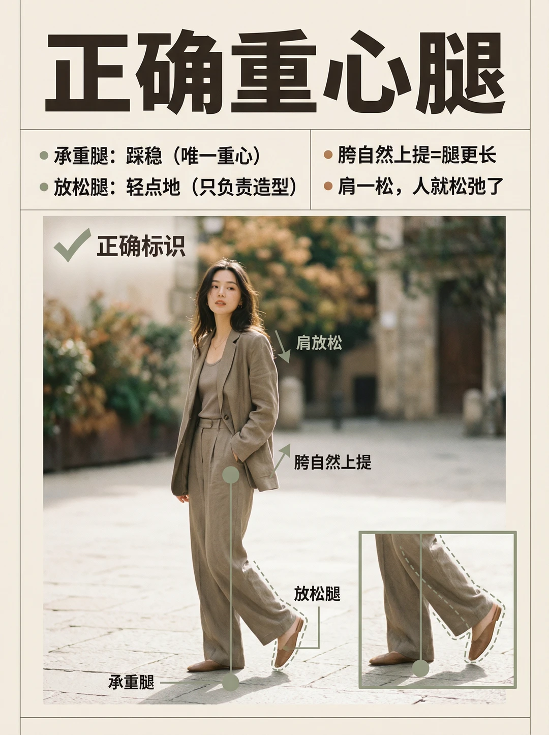 把重心放在一条腿上(承重腿踩稳),另一条腿放松轻点地,胯会自然上提,腿立刻更长、线条更顺;肩颈也会跟着放松,整个人瞬间松弛不做作📸
