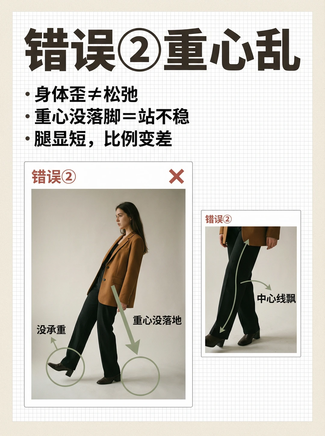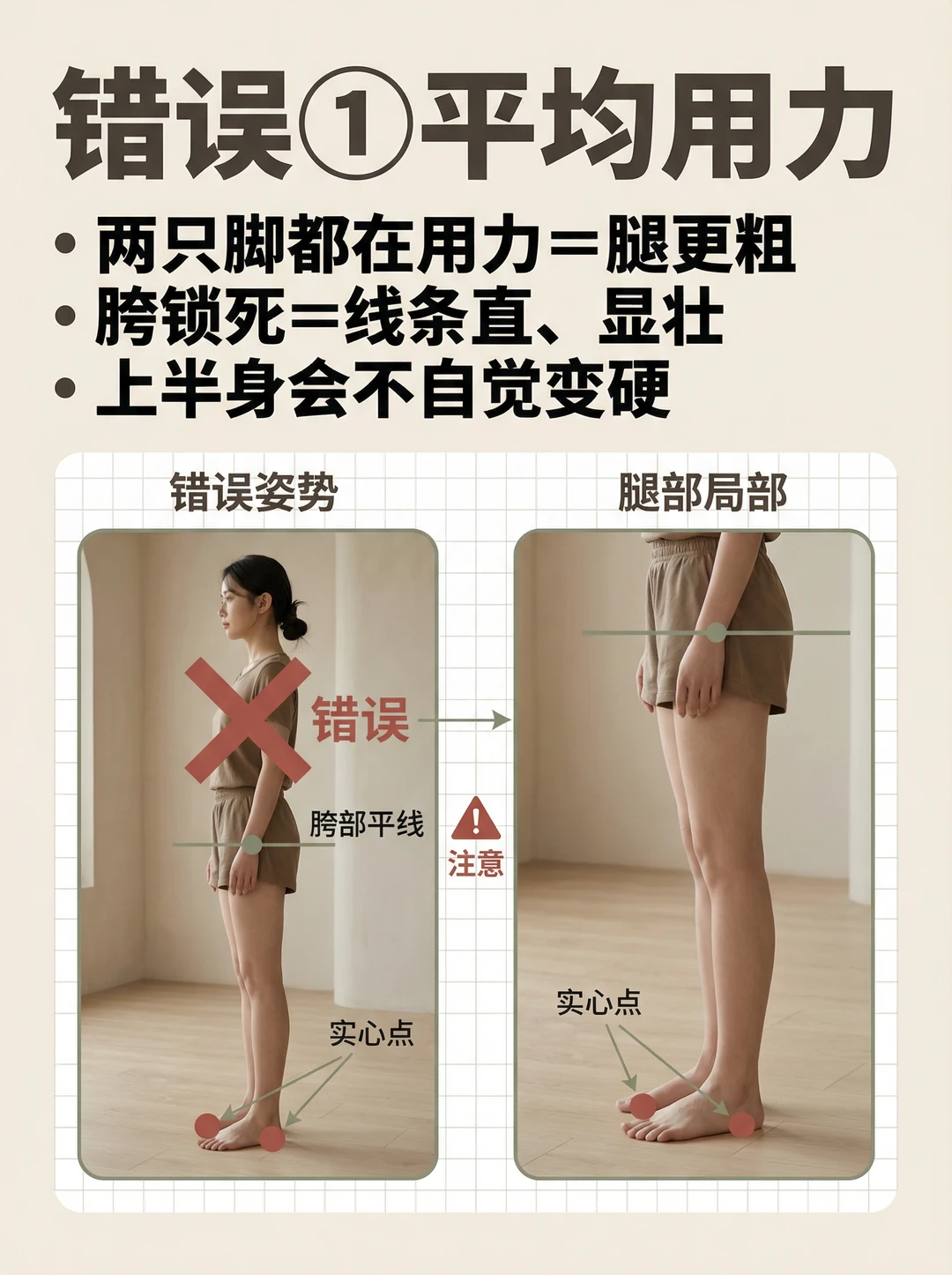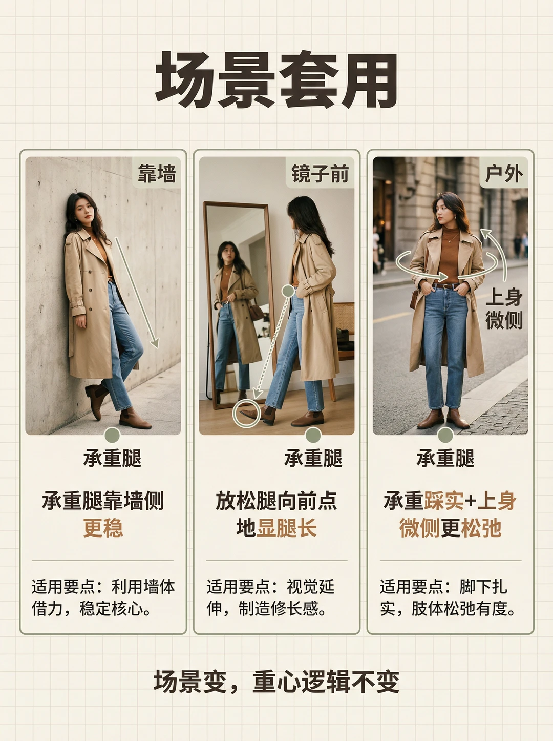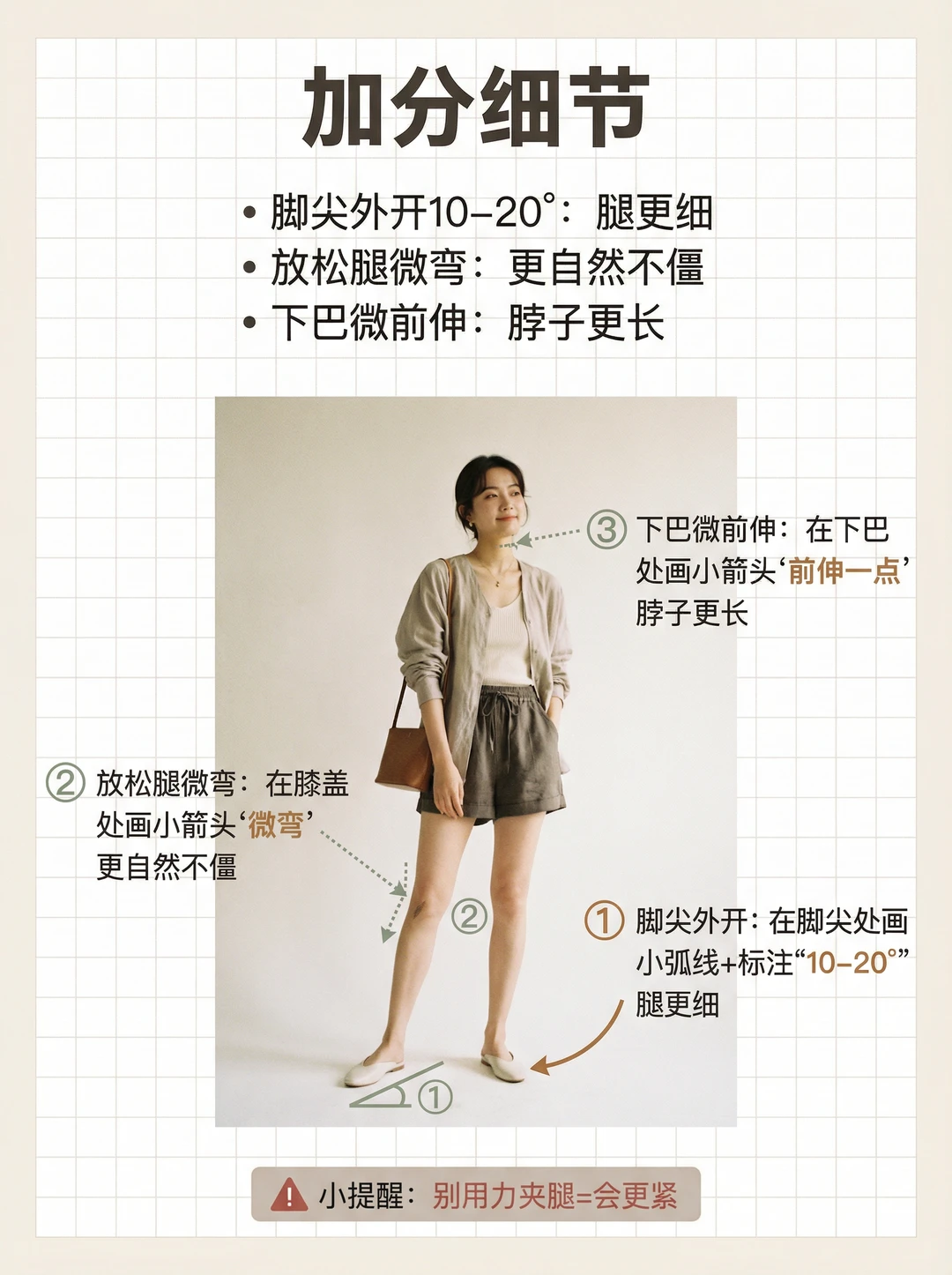 我还做了:错误vs正确对比、3个动作要点、加分细节(脚尖10–20°/放松腿微弯/下巴微前伸)以及3种场景套用(靠墙/镜子前/户外)📌