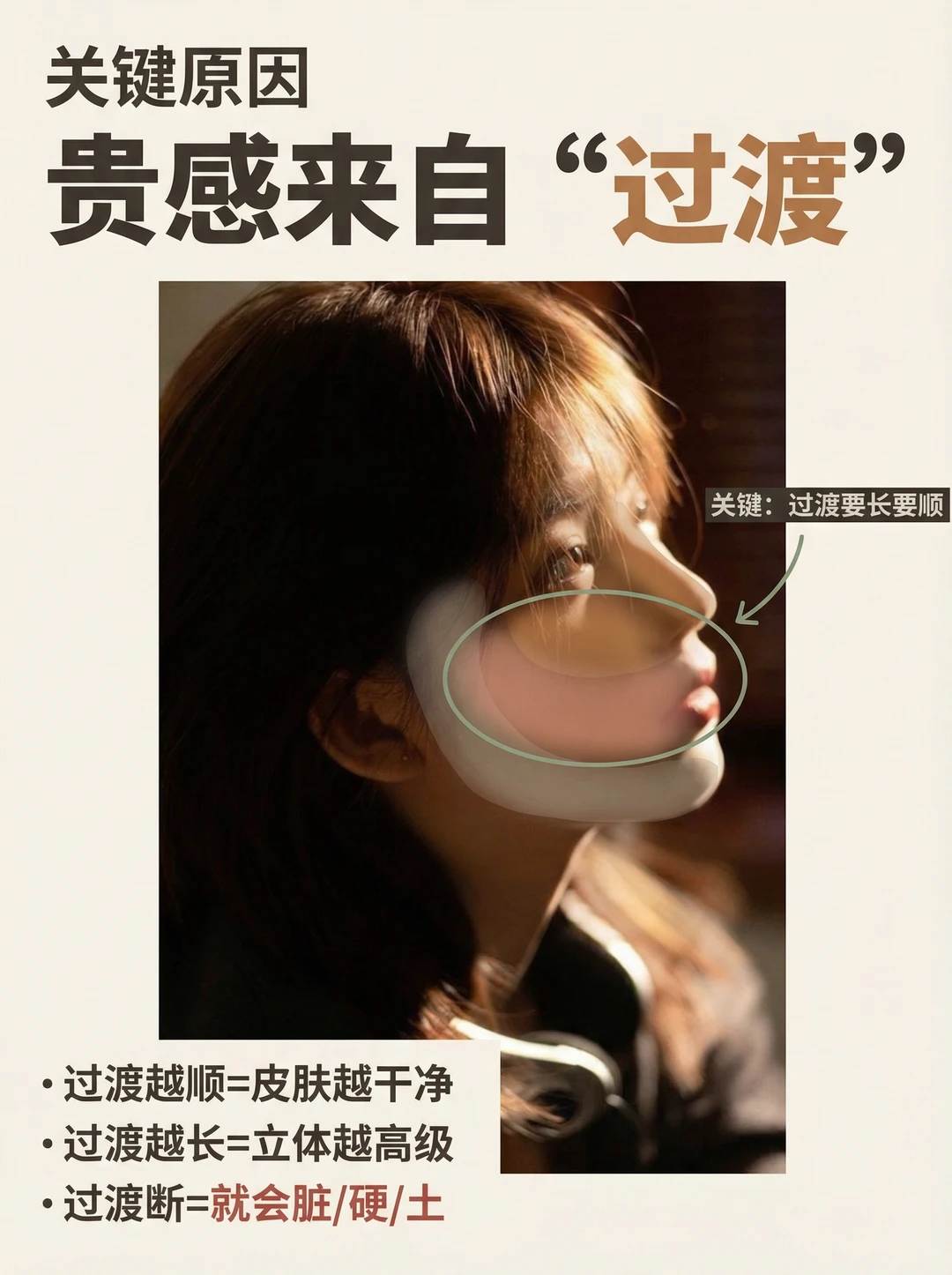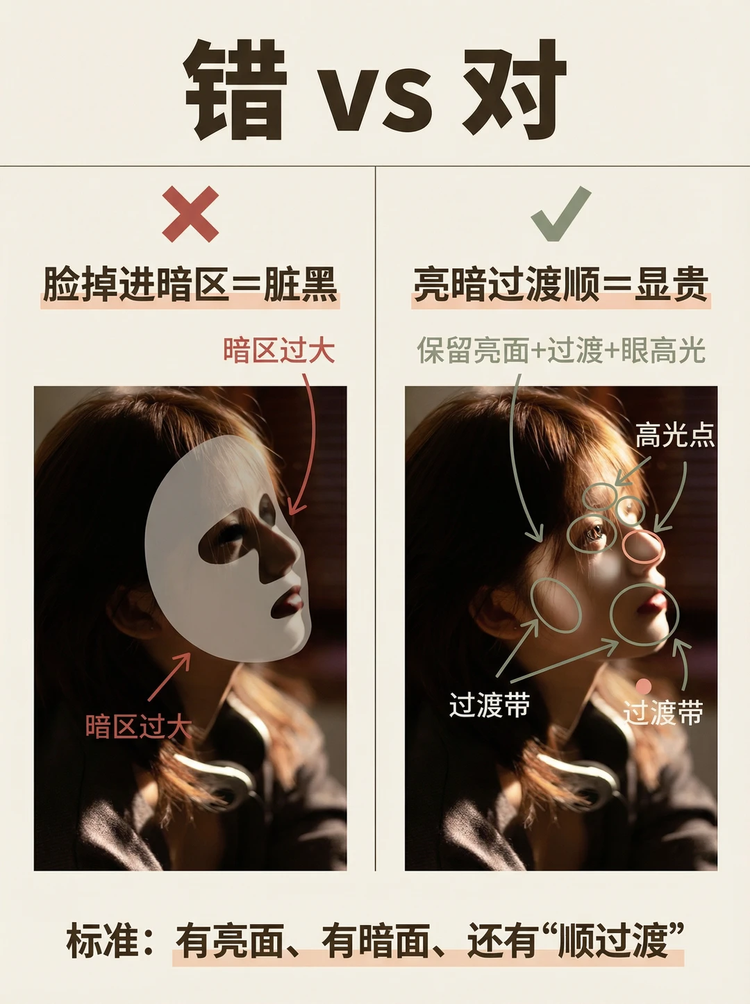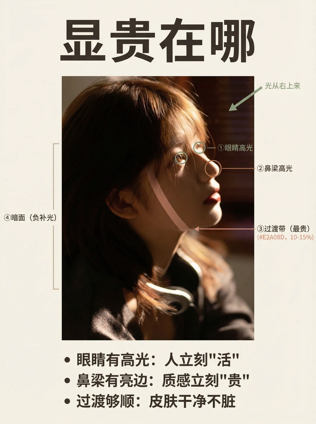 你有没有这种崩溃👇 📸 明明用了侧光,人却拍成脸黑一块、鼻影一刀切、皮肤发脏…怎么看都不高级😩 其实侧光“显贵”不是滤镜,而是你有没有拍到这3个证据✅ 这张图我只标了4个点,一看就懂✨ ① 眼睛高光:没有高光=人不“活”👀 ② 鼻梁亮边:这条亮边一出来,质感立刻“贵”✨ ③ 脸颊过渡带:高级感的核心不是亮,而是亮→暗过渡够顺 ④ 暗面(负补光):暗得干净,画面才不脏 你照着做:让脸落在“过渡区”,别让脸掉进暗区;宁可略暗,也别炸高光📌