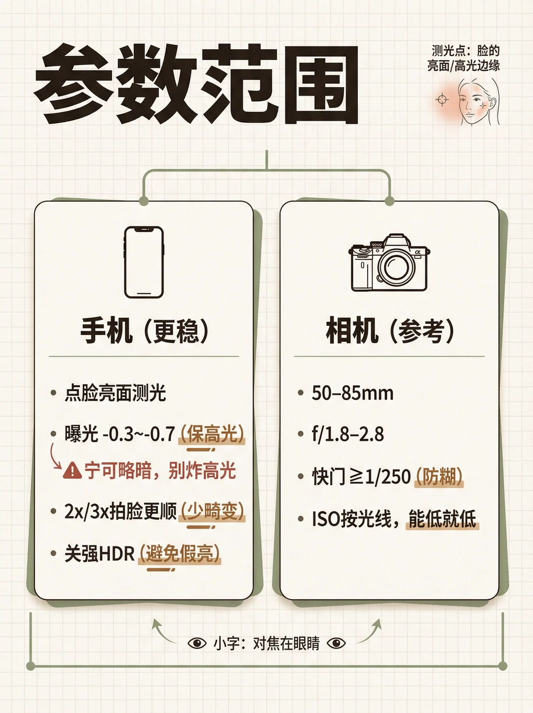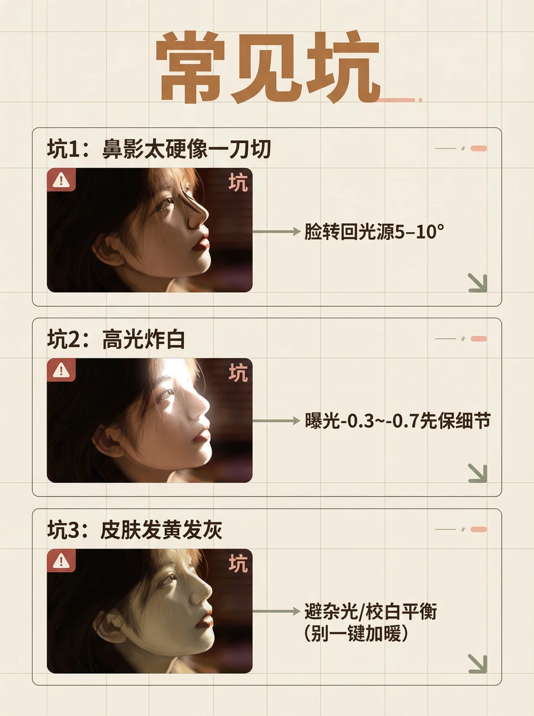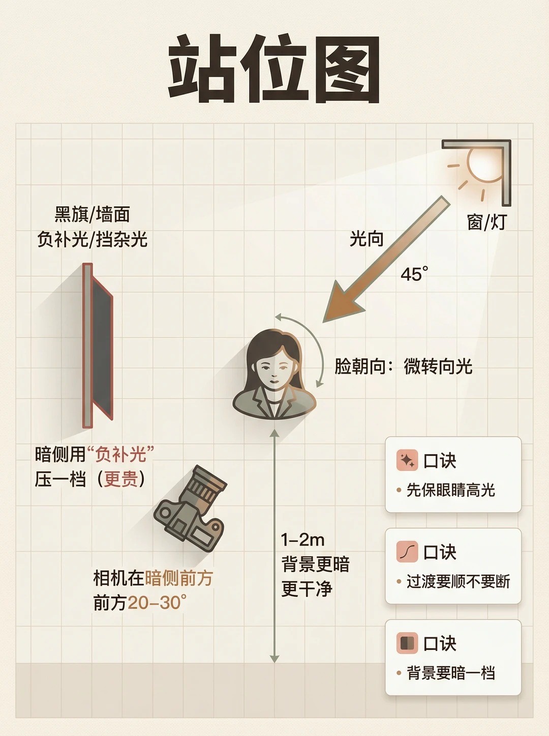 你有没有这种崩溃👇 📸 明明用了侧光,人却拍成脸黑一块、鼻影一刀切、皮肤发脏…怎么看都不高级😩 其实侧光“显贵”不是滤镜,而是你有没有拍到这3个证据✅ 这张图我只标了4个点,一看就懂✨ ① 眼睛高光:没有高光=人不“活”👀 ② 鼻梁亮边:这条亮边一出来,质感立刻“贵”✨ ③ 脸颊过渡带:高级感的核心不是亮,而是亮→暗过渡够顺 ④ 暗面(负补光):暗得干净,画面才不脏 你照着做:让脸落在“过渡区”,别让脸掉进暗区;宁可略暗,也别炸高光📌