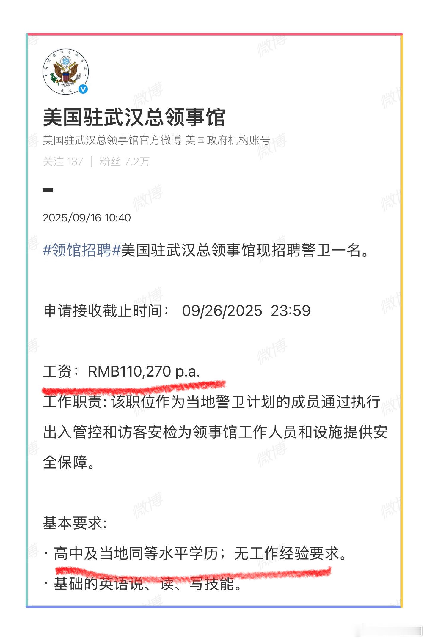 《保安与母校》1、图一,熊某,211武汉理工大学毕业,月薪3800元,主业某小区保安,副业小视频博主……在小视频上自我曝光母校是武汉理工后,被母校关切约谈。2、图二, 美国驻武汉总领事馆去年9月招聘保安广告,年薪110270元,折算月薪9189元……我看了招聘条件,熊某完全够格。3、武汉大学希望自己的毕业生都是雷军,杭州师范大学希望自己的毕业生都是马云,深圳大学希望自己的毕业生都是马化腾……心情我能理解,但现实也要面对。做保安不够高大上,但好歹每月有3800元的进账。这些年比低薪更可怕的是没有工作,比没有工作更可怕的,是有一屁股负资产。有人说熊某涉嫌蹭母校的流量,我看这没什么大不了,人家有盖钢印的毕业证,又不是虚假宣传。再说了,流量也能出状元,比如董宇辉……顺便问一嘴,你知道董宇辉的母校吗?