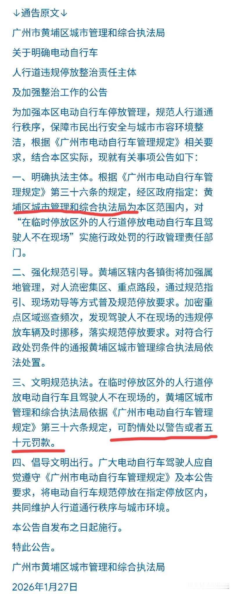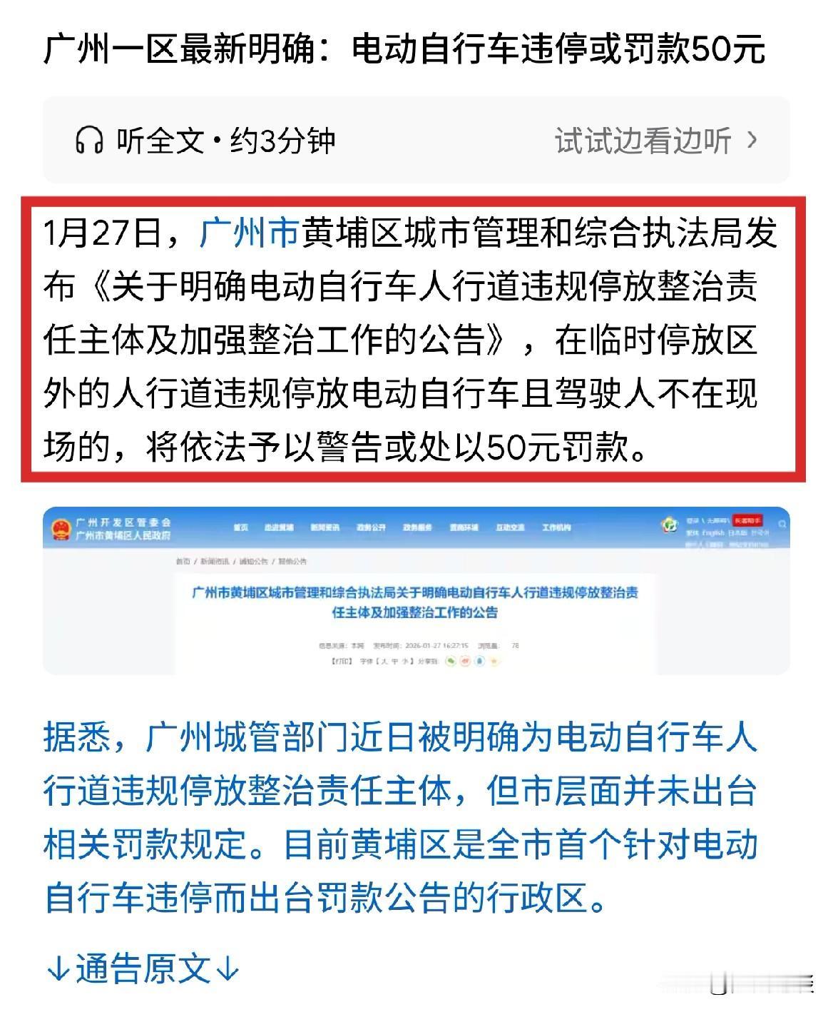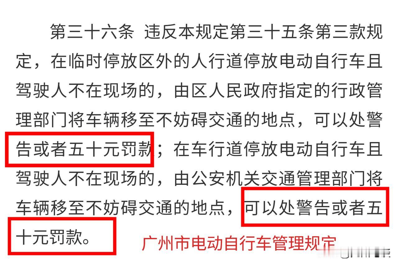 【重磅】电鸡违停罚款50蚊!广州首个对电动自行车违停开罚的区出炉! 面对广州数百万辆电动自行车,电动自行车违停现象日益严重,导致道路阻塞,行人车辆通行困难,降低了道路通行效率。 黄埔区根据本区实际情况,依据《广州市电动自行车管理规定》第三十六条,对乱停乱放的车辆进行警告或者罚款50元。 黄埔区指定执法主体是城管局,并不是交警部门,执法力量更加充足。 当然了,相关部门也需要提供电动自行车临时停放区,在画线区域停放是没有问题的。 满足电动自行“有路走,有电充,有地停”的宗旨。 那么,哪些地方不能停呢? 首先就是“校、医、地、口”等重点区域。 学校、医院门口,地铁站,道路交叉路口等。这些地方是禁止停车的,无论是机动车还是非机动车。 图三:正确停车。 在划线区域停车,就是标准的停车方法,不用担心被拖车和罚款。 图一,图二:错误停车。 广场上禁止停放车辆。 在广场人行横道对面停车,影响行人通行,就可能面临拖车或者罚款。