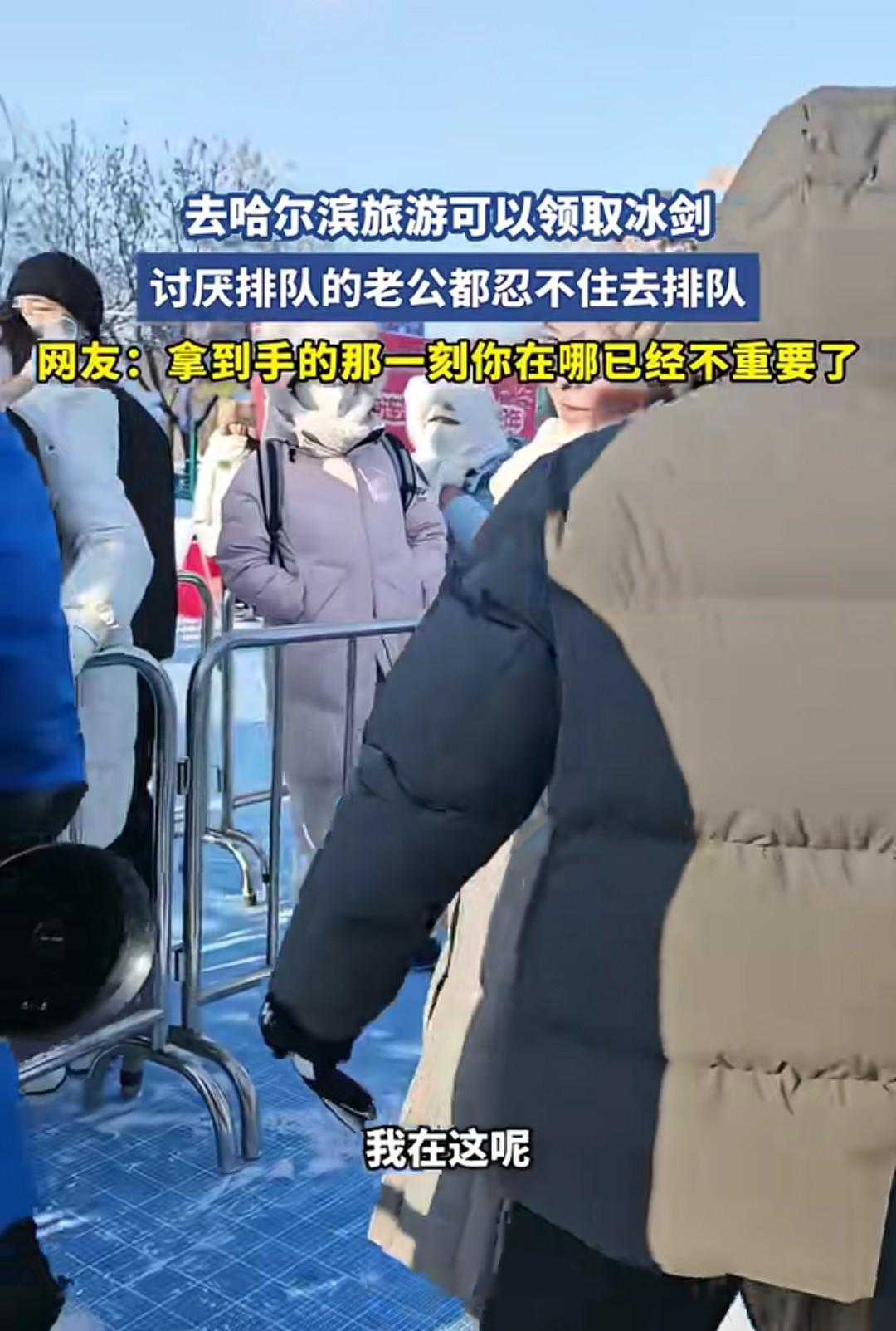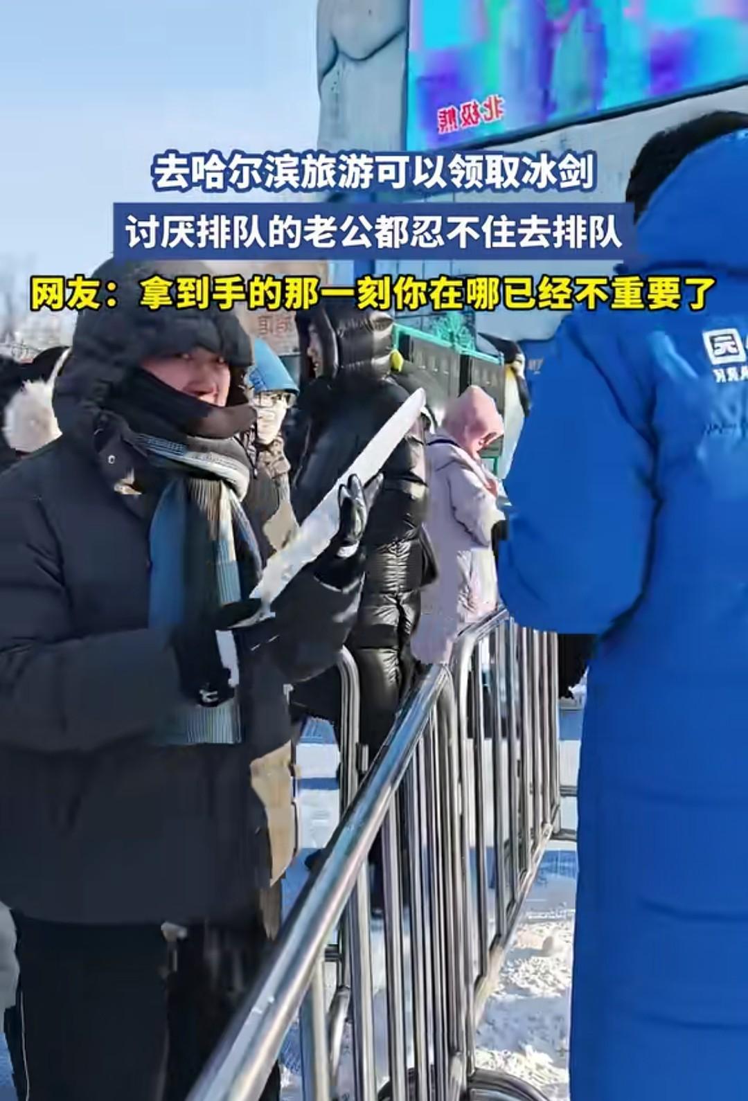 还是哈尔滨会玩啊!这是用冰雕刻的宝剑,看起来真不错,想要! 这个博主她老公讨厌排队,但是还是排队领了一把,拿到剑之后,博主不停跟在他身后说“我在这呢。” 只是她老公头也不回,提着冰雕宝剑在前面走的六亲不认! 有人调侃博主说,拿到剑的那一刻,你在哪里已经无所谓了!