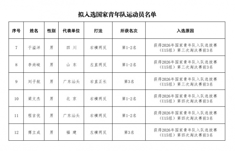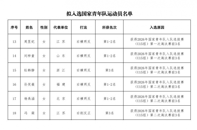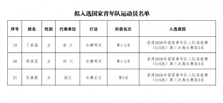 根据中国乒乓球协会关于举办2026年国家青年队入队选拔赛(U15组)的通知及《2026年国家青年队入队选拔赛(U15组)竞赛规程》要求,21名运动员拟入选国家青年队。现对运动员名单进行公示,公示期为2026年1月29日至2026年2月3日(名单附后)。