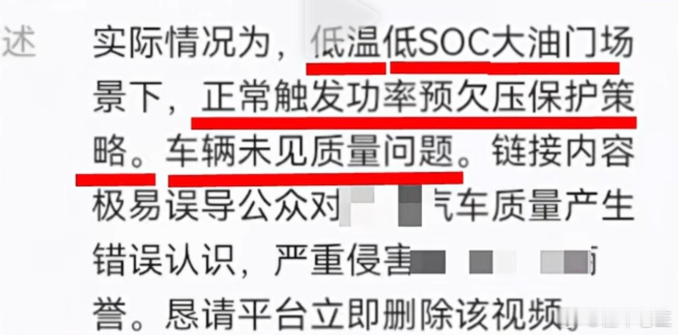 百公里加速20秒是什么梗啊,查了一下,说是某奇特品牌的一个增程SUV的用户反馈。不过,一般增程的话,基础的保电能力应该都是有的,据说还是40%的SOC情况下出的问题。这太奇怪了……属于个例还是通病,我觉得要看几点。第一,就是看增程系统的保电能力强不强, 发动机加入、功率的外特性是不是强劲,其实增程车的话,天然就有保电逻辑,一般会在30%~40% SOC 以上,发动机强制介入,功率有一个系统兜底,理论上不该出现“踩下去没啥反应然后加速20秒开外”的情况。第二,比较可笑的是,用户投诉后的厂家反馈说是控制策略可能触发了功率限制的保护,但这种保护触发并不是企业搪塞用户的借口吧?在用户投诉抱怨的视频的投诉流程中,以所谓的低温、低SOC大油门场景,正常触发功率欠压保护进行搪塞,在没有出具任何图表、数据、视频证据的情况下,断然和平台申诉且下结论说未见车辆质量问题。 然后申请平台删除视频,我想问 平台有多么不负责任才会删掉这个视频的? 而且如果连这种保护啥时候需要启动触发都掌握不了,只能说明整体企业层次欠佳,提升空间还是蛮大的。第三,我觉得今后买车,要买什么品牌呢?就是这个品牌出了问题,媒体人愿意帮你发声的,而不是【出了问题申诉完了就会找到你单位领导,然后让车主的领导跟车主说,要么给个面子就算了】的品牌。 压力太大了 ,也太恐怖了 。