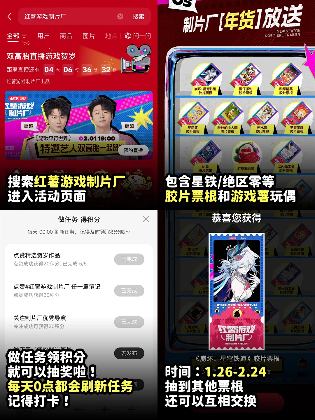 红薯游戏制片厂 星穹铁道日更挑战 崩坏星穹铁道创作者激励计划 崩坏星穹铁道 记忆是梦的开场白 让我摸个鱼吧Moyu 星穹铁道攻略 星穹铁道二创 星穹铁道翁法罗斯 开拓时间到 ① 每天做任务可以获得积分,然后参与抽奖 ② 抽到其他游戏的票根可以互相交换哦 ③ 红薯游戏制片厂还有其他笔记&直播活动,可以康康捏