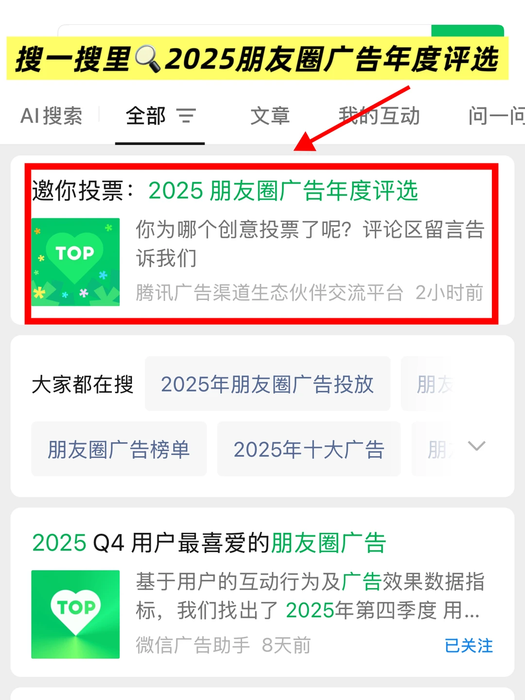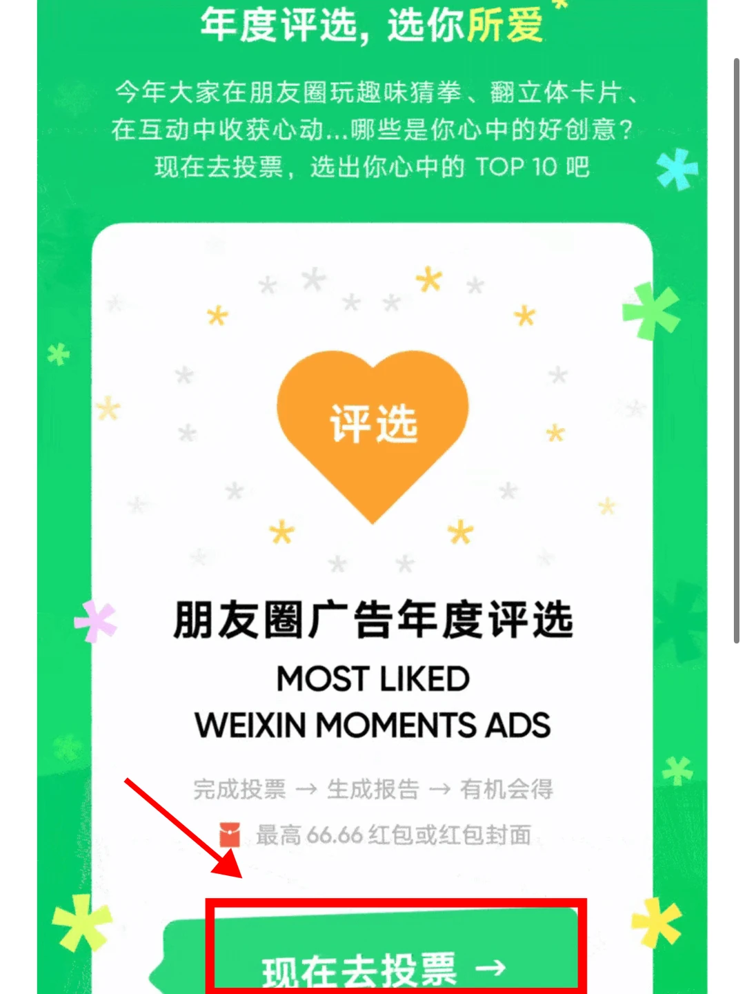 千万别错过这个大好机会,你担正在等着你,在wx🔍搜索【2025朋友圈广告年度评选】参与投票,为你的偶像添砖加瓦(btw:最高可得66.66红包和红包封面哦~,投票以后还有贴心的元宝帮你总结喜好报告,让你更清楚跟偶像之间的共通点,好的明星值得粉丝的喜爱与支持,反正我已经迫不及待了,给我喜欢的明星们都投上一票,让他们2026年继续走花路,未来还很长我们一起走啊[派对R]
