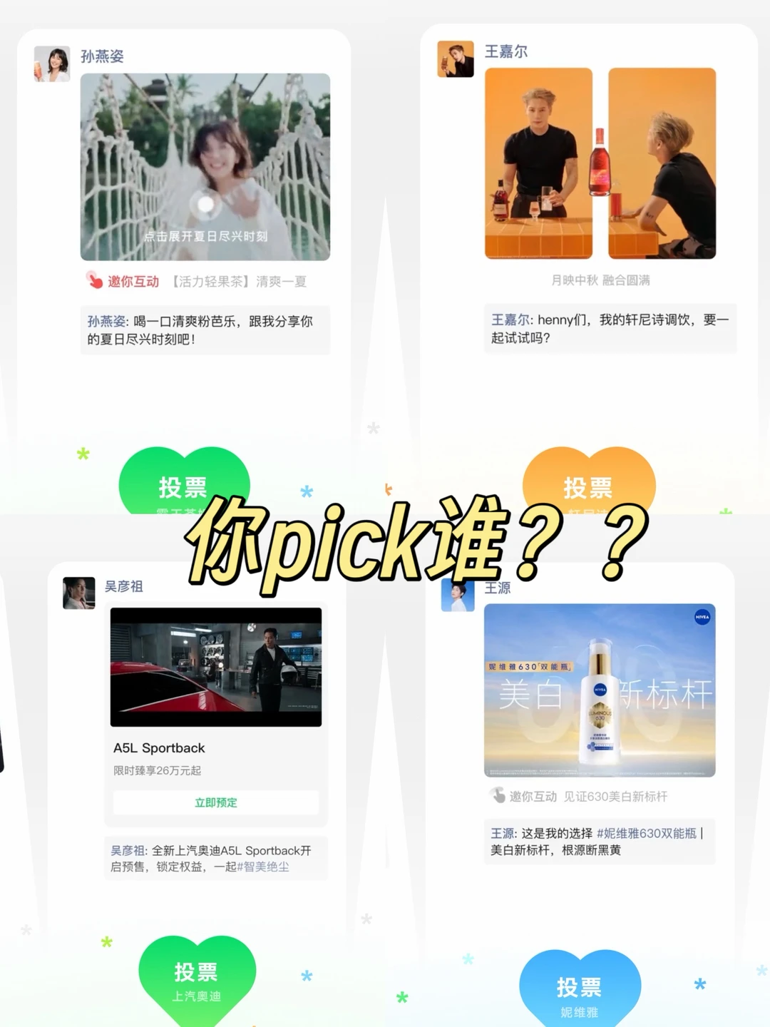 到底谁还没在朋友圈刷到明星广告啊!不管饭圈女孩们怎么吵,数据是不会骗人的,看到明星们的广告我真的走不动一点,他们怎么那么会拍那么好看啊!杨幂、易烊千玺、王源、孙燕姿、蔡徐坤、范丞丞等...你在pk谁?