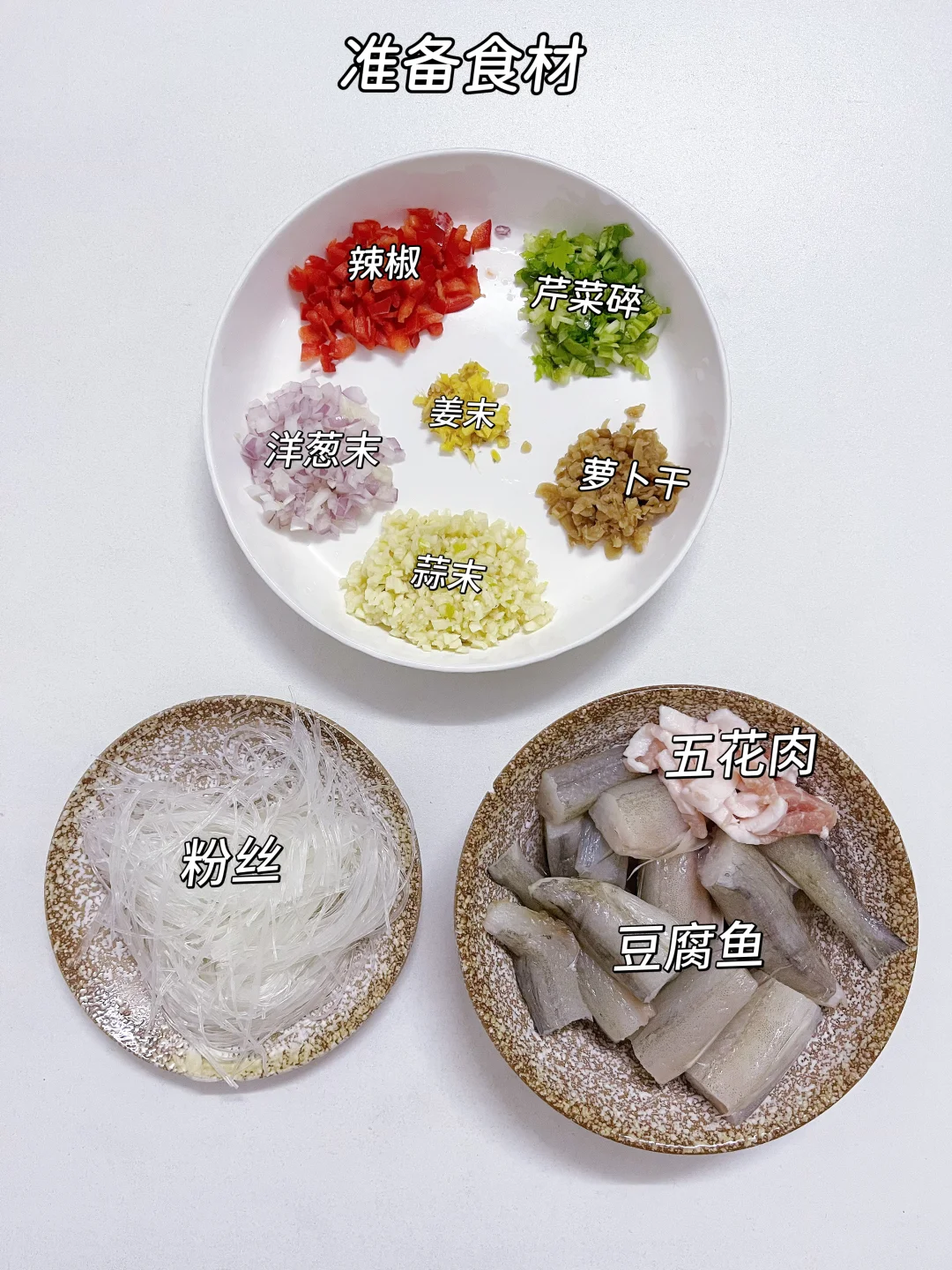 豆腐鱼8条(一定要选新鲜的),五花肉8片(切丝),粉丝1小捆,蒜末3勺,姜末、洋葱末、辣椒碎、萝卜干、芹菜碎各1勺,酱油、蚝油各1勺。