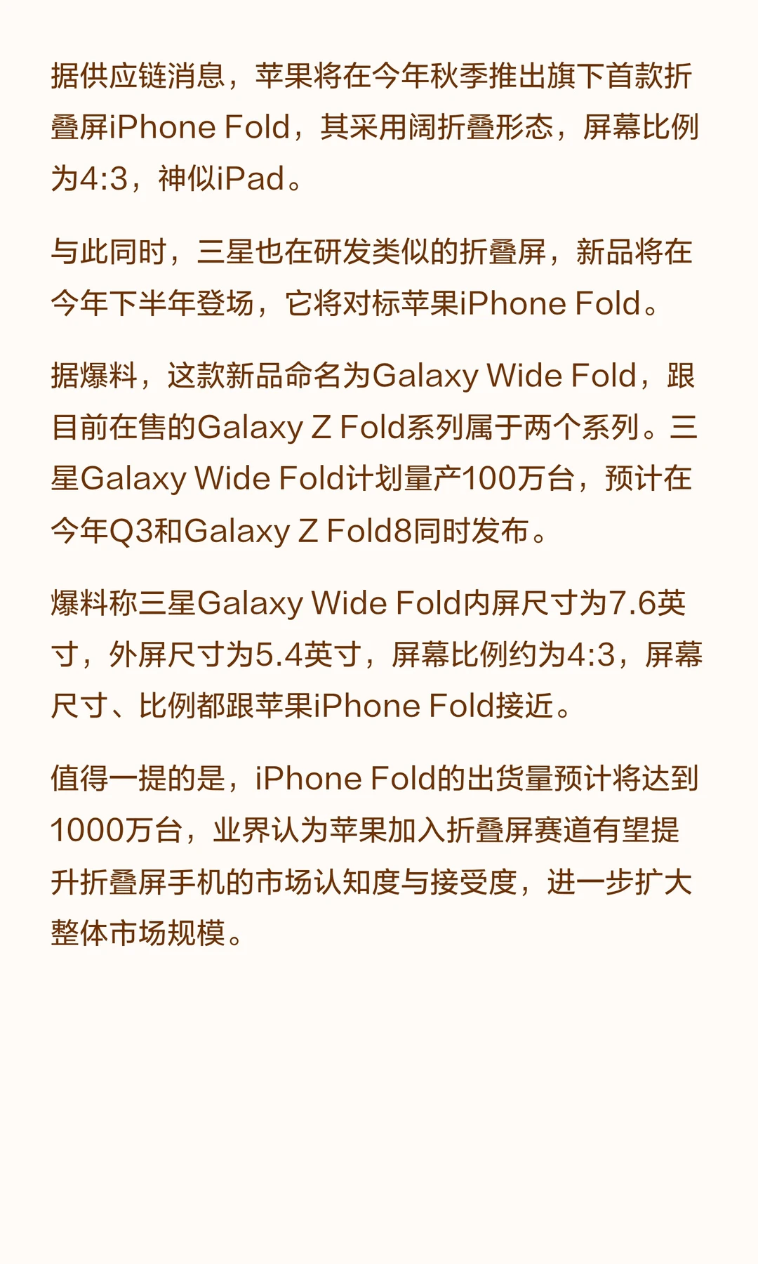 苹果秋季推出首款折叠屏iPhone Fold,屏幕比例4:3,对标三星Galaxy Wide Fold。三星Galaxy Wide Fold预计今年Q3发布,内屏7.6英寸,外屏5.4英寸,计划量产100万台。苹果iPhone Fold预计出货1000万台。