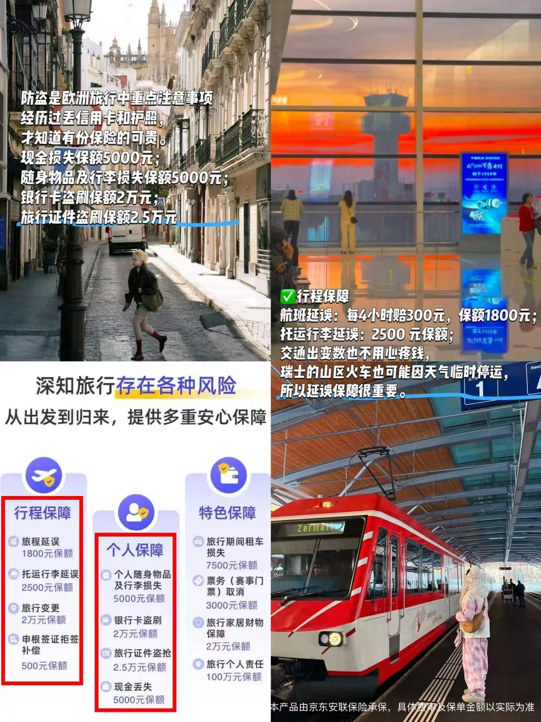 航班延误保障,每 4 小时赔 300 元, 保额 1800 元,托运行李延误:2500 元保额,交通出变数也不用心疼钱-欧洲的机场经常罢工,希腊海岛间的轮渡容易因风浪延误,瑞士的山区火车也可能因天气临时停运,所以延误保障很重要,万一真的不巧还能缓解滞留焦虑,也能挽回一些时间损失。