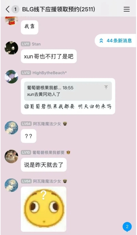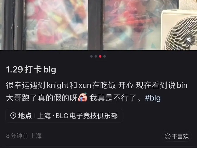 直播吧01月29日讯疑似BLG粉丝群消息,打野Xun去开导离开基地的的Bin;但其他网友透露今天看到Xun和Knight在BLG基地吃饭,这就代表Xun没有离开基地去开导Bin。