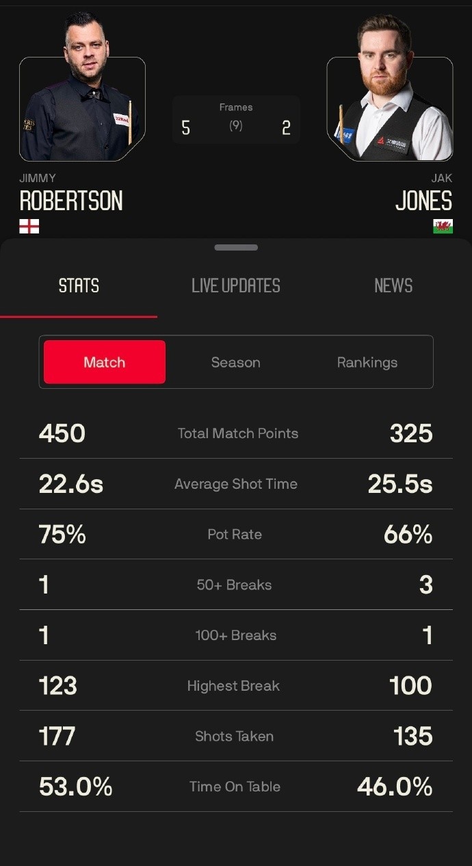 比赛过程中,吉米·罗伯逊打出一杆破百(123)和一杆50+(71),杰克·琼斯打出一杆破百(100)和两杆50+(77、60)。