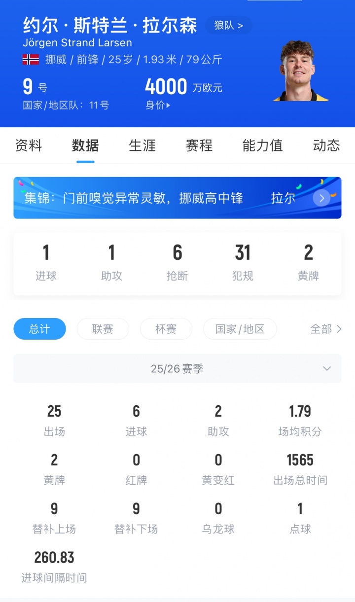 拉尔森现年25岁,去年夏窗以2700万欧加盟狼队,他本赛季为球队出场25次,贡献6球2助,现身价4000万欧,他与狼队的合同至2030年。