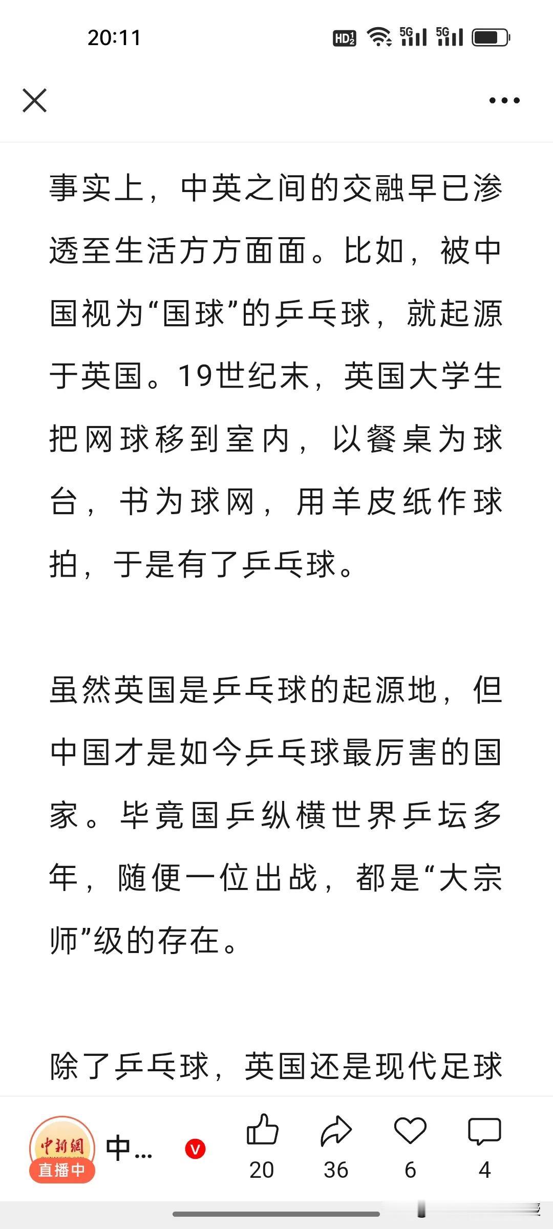 原来乒乓球的起源地是英国啊!连现代足球的起源地也是英国。刚刚看到《中国新闻网》发的一篇文章,科普了一个冷知识。中国引以为豪的“国球”乒乓球原来是起源于英国,国际足联认证的“足球发源地”,其实是中国,但是现代足球发源地是英国。 原来,中英体育的双向交融早已刻入时光,如今英国首相斯塔默访华,更让这份跨越山海的体育联结,成为两国相知相伴、携手同行的美好纽带。