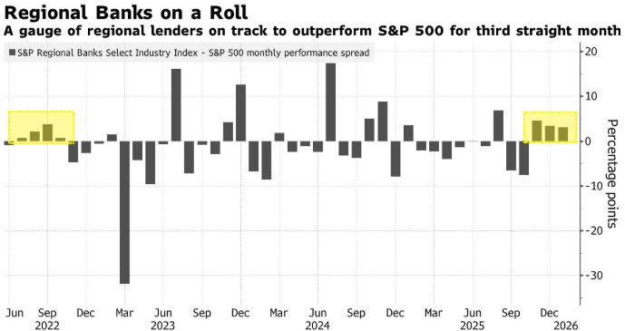 规模达40亿美元的道富SPDR标普区域银行ETF今年已上涨4.6%,超过了标普500指数1.9%的涨幅,并且相对于更广泛的金融股指标达到2024年以来的最高水平。这一与美国消费者密切相关的板块的突破性表现,为更广泛的股市发出了积极信号。此前,股市的上涨主要受人工智能交易热潮的推动,直到去年11月才有所回落。