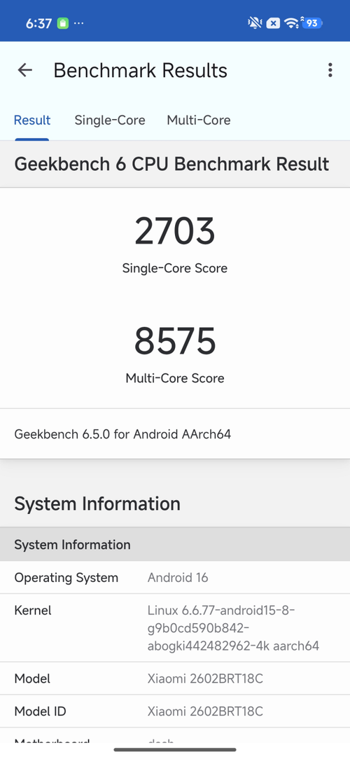 GeekBench6的单核心分数为2703,多核心分数为8575.