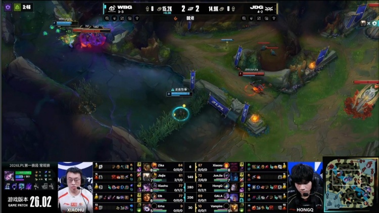 [15:11]Junjia梦魇关灯飞上配合HongQ发条再秒xiaohu辛德拉,JDG回头吃掉先锋,Junjia随后再次关灯飞中配合GALA芸阿娜击杀Elk,JDG中上推掉WBG下路一塔,经济领先4k。