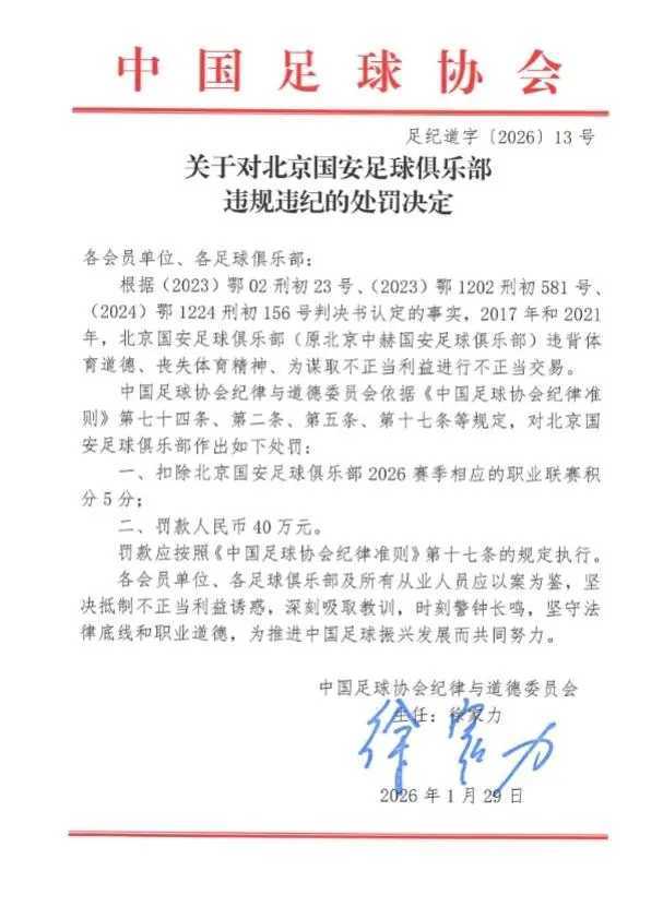 北京时间1月29日,中国足协正式公布了“假赌黑”专项整治行动受处罚的俱乐部名单。新赛季中超共计有9支队将被罚从负分起步,其中就包括申花、海港、国安、泰山等争冠队。北京国安