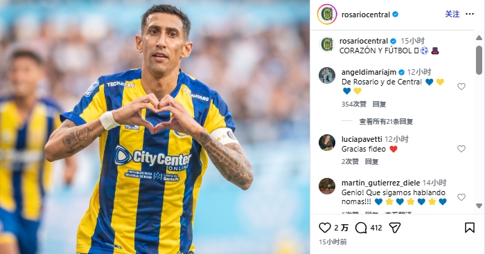 迪马利亚即将满38岁,秋季联赛2轮出场178分钟,打进2球。