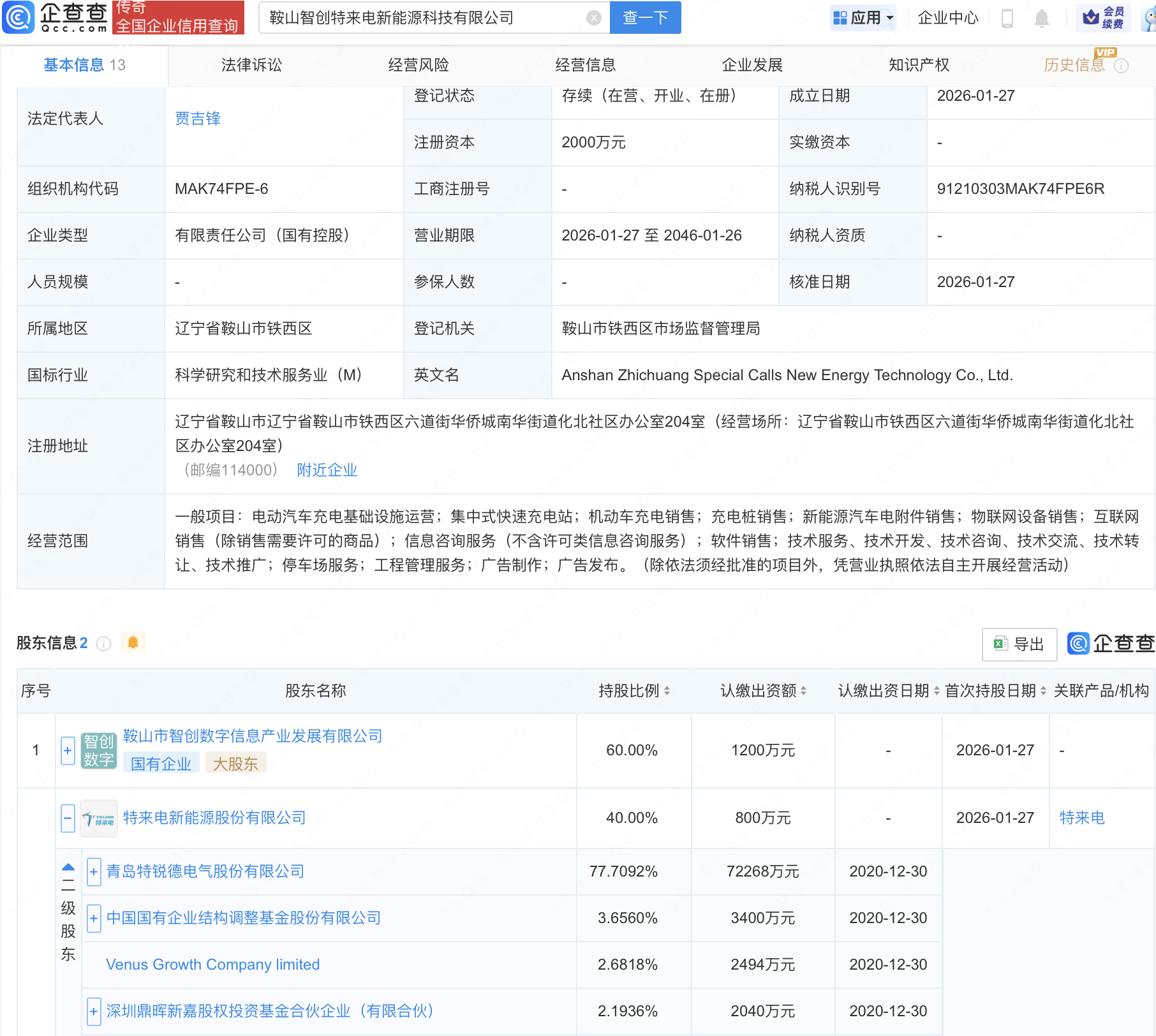 企查查APP显示,近日,鞍山智创特来电新能源科技有限公司成立,注册资本2000万元,经营范围包含:电动汽车充电基础设施运营;集中式快速充电站;机动车充电销售;充电桩销售等。企查查股权穿透显示,该公司由特锐德(300001)旗下特来电新能源股份有限公司等共同持股。