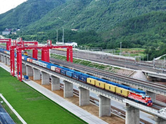 “滴滴滴——”在枢纽港内,智能引导无人集卡车在智控中心统一调度下高效穿梭于堆场与铁路装卸线之间,与40多米高的自动化轨道式龙门吊协同作业,精准完成集装箱吊装。不久后,一趟“义乌—宁波舟山港”海铁联运班列鸣笛启程。