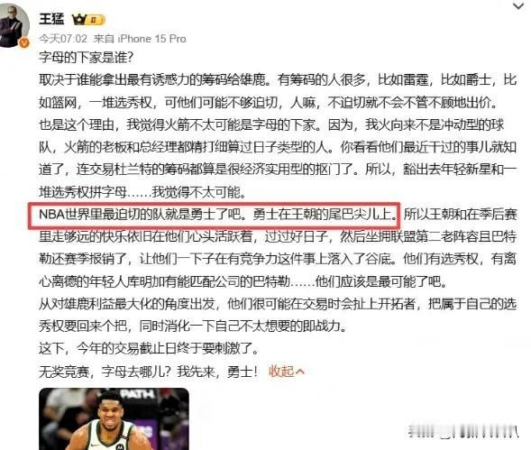 字母哥即将告别雄鹿队?勇士队“7换1”交易方案能否助力其重现王朝辉煌? NBA交易市场再度风起云涌。 1月29日,多家权威媒体爆料,字母哥已下定决心离开雄鹿,他与雄鹿长达12年的携手之旅或许即将画上句号。 当下,雄鹿队的战绩仅为18胜27负,在东部排名第12位,球队管理层已然开始倾听各队的报价。 要是没有得到足够诱人的筹码,这笔交易可能会推迟到今年夏天。 近期,字母哥因小腿拉伤,预计要休战4至6周,这无疑让他离队的传闻甚嚣尘上。 国内知名解说员苏群和王猛也参与到这一话题的讨论中来。 王猛觉得火箭的机会并不大,因为球队管理层的态度过于谨慎;而苏群则看好火箭可能会有所行动。 目前,尼克斯、热火、森林狼和勇士这几支球队被视作字母哥最有可能的下家,其中勇士凭借库明加、多个首轮选秀权以及灵活的合同匹配方案,成为最有诚意的竞争者。 倘若字母哥真能和库里联手,勇士队或许能够重新回到争冠行列。 另外,在比赛场上也有新动态。 湖人以99 - 129惨败给骑士,41岁的詹姆斯全场仅得到11分,但他也创造了常规赛出场时间突破60000分钟的新纪录。 勇士则以140 - 124大胜爵士,库里砍下27分,在历史得分榜上的排名升至第19位。 三位球星、三支球队,接下来是能够逆风翻盘,还是会让整个联盟格局彻底洗牌?字母哥的新东家会是勇士队吗?这一系列动态,着实值得我们持续关注! 各位读者你们怎么看?欢迎在评论区讨论。