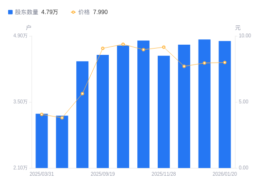 日期A股户数(户)流通A股户均持股数(股)户均持股市值(万元)2026-01-204792217922.9714.322026-01-094824617802.6014.152025-12-314715718213.7214.022025-11-284479819172.8317.542025-10-314803217881.9216.022025-09-304696418288.5717.142025-09-194499419089.3117.292025-06-304361719691.9711.092025-04-103209326762.9910.172025-03-313250926420.5110.73